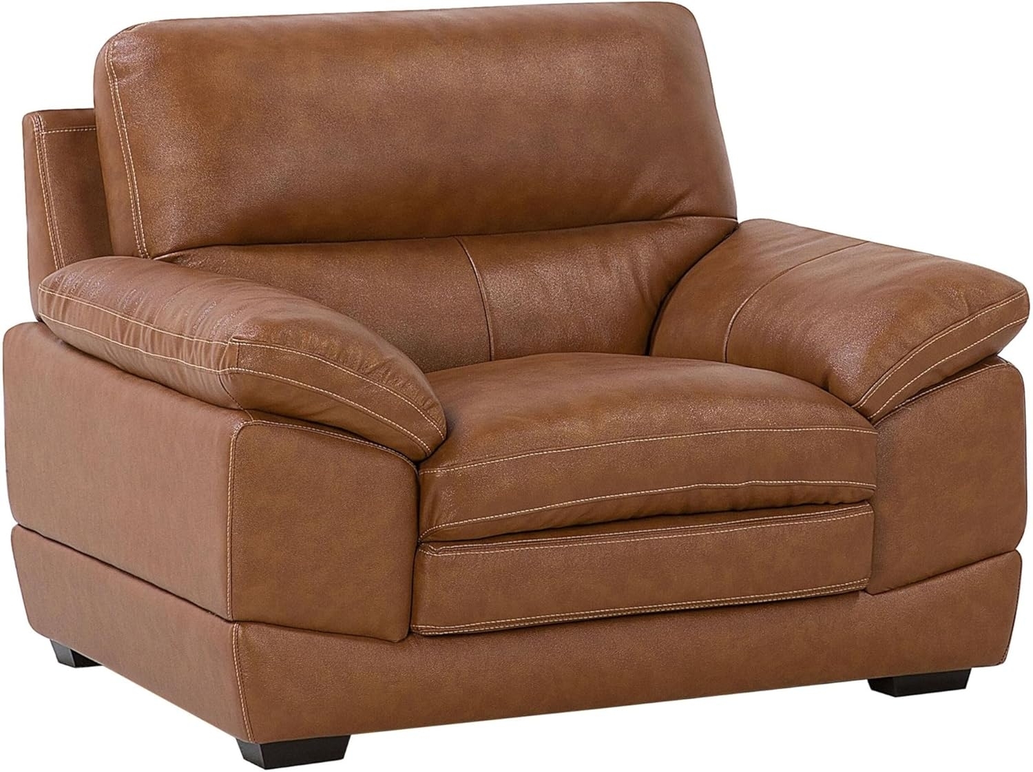 Echtleder Sessel HORTEN in goldbraun bietet Ihnen einen eleganten Entspannungsplatz in Ihrem Wohnzimmer. Der breite, tiefe Sitz aus hochwertigem Echtleder sorgt für außergewöhnlichen Komfort. Die pflegeleichte Polsterung und der natürliche Farbton ergänzen jede Einrichtung optimal. Mit einem stabilen Massivholzgestell und einer maximalen Belastung von 150 kg ist dieser Sessel sowohl stilvoll als auch langlebig. **Highlights** - Breite, bequeme Sitzfläche für optimalen Komfort - Retro Stil, der zeitlose Eleganz ausstrahlt - Hochwertiges Material für Langlebigkeit - Besonders pflegeleicht für einfache Wartung - Schutzkappen zum Schutz des Bodens **Produkteigenschaften** - Typ: Sessel - Stil: Retro - Farbe: Goldbraun - Material: Kunstleder - Füllmaterial: Schaumstoff - Gestellmaterial: Massivholz - Sitzmaterial: Kunstleder - Armlehnen: Mit Kissen - Sitzkonstruktion: Wellenfederung - Schaumstoffdichte: 25 kg/m³ - Abmessungen: - Höhe Armlehnen: 66 cm - Tiefe: 85 cm - Dicke der Polsterauflagen: 18 cm - Sitzhöhe: 41 cm - Breite: 115 cm - Höhe: 89 cm - Sitzfläche: 56x53 cm - Gewicht: 45 kg - Max. Belastung: 150 kg **Lieferumfang** - 1 x Sessel