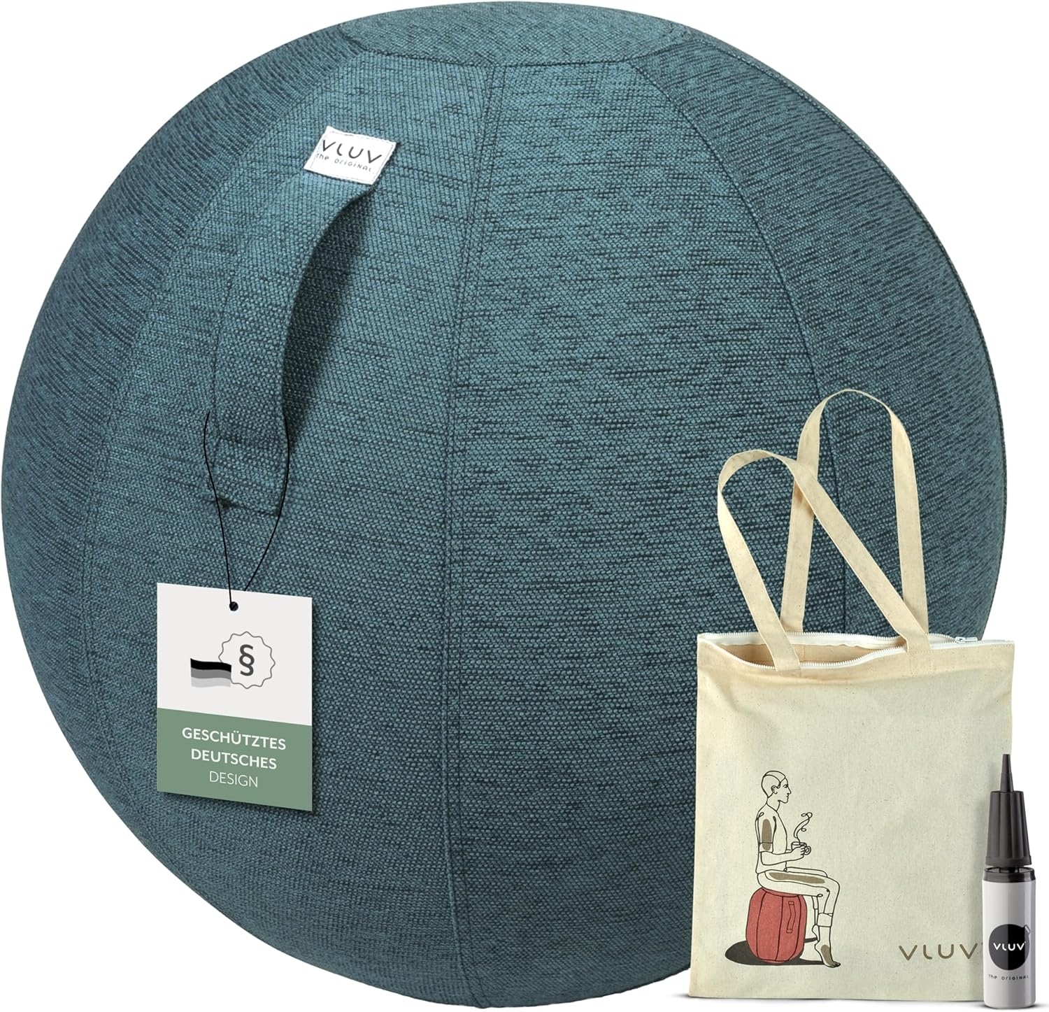 Der Vluv Stov Stoff-Sitzball in der Farbe petrol / blau-grün bietet mit einem Durchmesser von 70-75 cm eine gemütliche und ergonomische Sitzmöglichkeit für Körpergrößen von 180-200 cm. Die robuste, abnehmbare und waschbare Hülle aus Möbel-Polyestergewebe sorgt für Komfort, während der Innenball aus berst-sicherem PVC Stabilität gewährleistet. Der Sitzball ist für ein Körpergewicht von bis zu 120 kg geeignet. **Highlights** - Gemütliche Stoff-Ausführung des Vluv Ballkonzeptes - Ergonomisches Produkt zertifiziert vom IGR e. V. - Robuste und dennoch weiche Möbel-Polyestergewebe-Hülle - Innenball aus berst-sicherem PVC - Geeignet für Körpergrößen von 180-200 cm **Produkteigenschaften** - Durchmesser: 70-75 cm - Material: Außenhülle: 100% Polyester, Innenball: PVC - Doppelte Kappnaht für Stabilität - Praktischer Tragegriff für einfachen Transport - Geeignet bis ca. 120 kg Körpergewicht **Lieferumfang** - Außenhülle - Innenball - 2 Ventile - Ventilheber - Pumpenadapter - Bedienungsanleitung