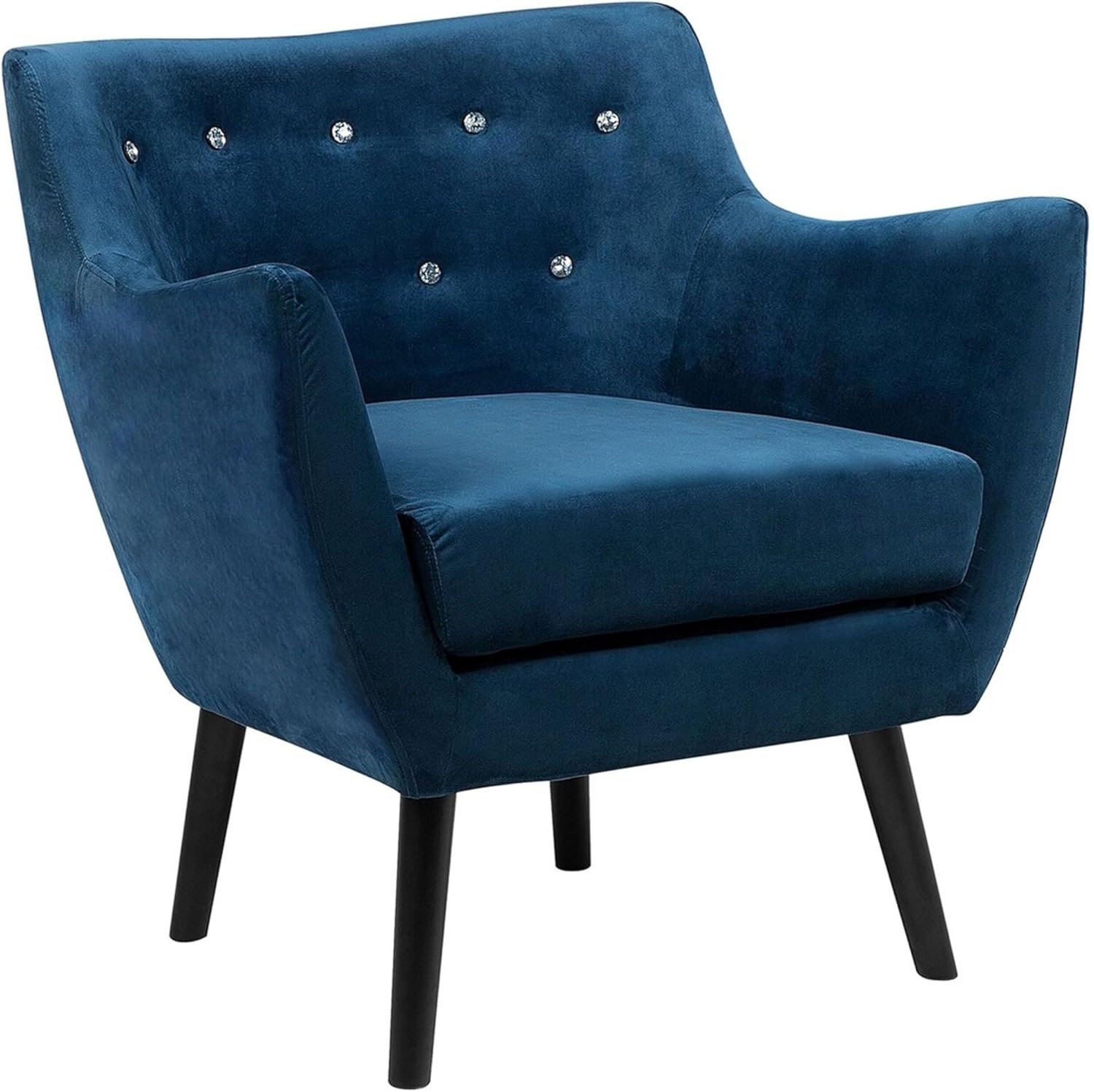 Gemütlicher Sessel im eleganten Marineblau mit Retro Flair. Der Sessel bietet optimalen Sitzkomfort durch eine breite Sitzfläche und ein angenehm gepolstertes Sitzkissen. Die geschwungenen Armlehnen und der pflegeleichte Rundumbezug aus strapazierfähigem Samtstoff sorgen für eine gemütliche Ausstrahlung. Stabilität verleihen die schlanken, leicht schräg stehenden Beine aus Gummibaumholz in elegantem Schwarz. **Highlights** - Optimaler Sitzkomfort für entspannte Stunden - Pflegeleichter Rundumbezug aus strapazierfähigem Samtstoff - Retro Flair, der sich perfekt in verschiedene Einrichtungsstile integriert - Stabilität durch schlanke Beine aus Gummibaumholz - Seidenweicher, geschmeidiger Stoff für ein angenehmes Sitzgefühl **Produkteigenschaften** - Typ: Sessel - Stil: Glamourös - Farbe: Marineblau - Material: Samtstoff (100% Polyester) - Gestellmaterial: Massivholz - Füllmaterial: Schaumstoff (Schaumstoffdichte: 24 kg/m³) - Armlehnen: Abgesenkt, ja - Sitzkonstruktion: Elastische Gurtbänder - Abmessungen: - Höhe: 84 cm - Breite: 71 cm - Tiefe: 54 cm - Sitzhöhe: 47 cm - Sitzfläche: 57 x 54 cm - Höhe Armlehnen: 68 cm - Dicke der Polsterauflagen: 13 cm - Gewicht: 16 kg - Max. Belastung: 160 kg **Lieferumfang** - 1 x Sessel - Beine/Füße nicht montiert
