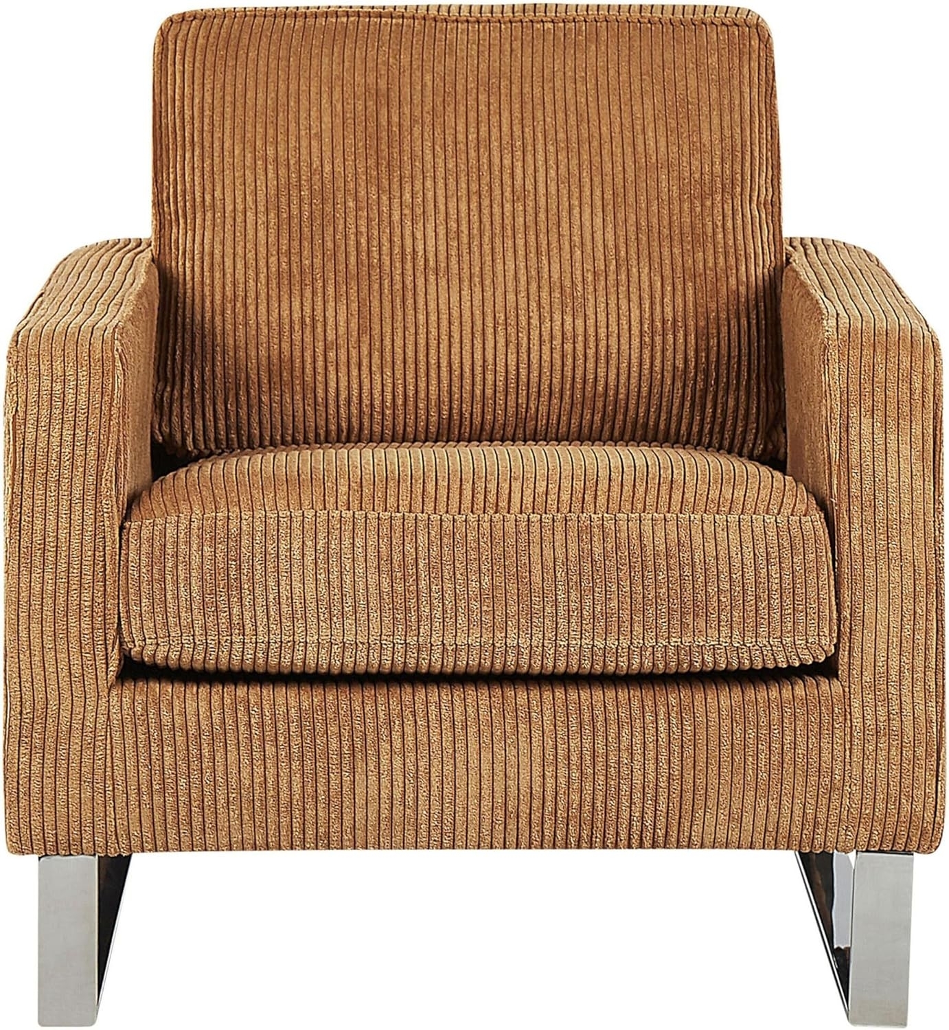Ein stilvoller Clubsessel in Goldbraun mit hochwertiger Cord-Polsterung und komfortablen Armlehnen. Die edle Ausstrahlung wird durch die Metallkufen unterstrichen. Retro-Design trifft auf modernen Komfort. Maße: B76 x H82 x T82 cm, Sitzhöhe 44 cm. Max. Belastung: 200 kg. Inkl. Montageanleitung. **Highlights** - Ausgezeichneter Komfort: Hochwertige Polsterung und bequeme Armlehnen - Traditionelles Design mit moderner Note: Stilvoller Clubsessel in Goldbraun - Passt zu vielen Einrichtungsstilen: Vielseitig kombinierbar - Hochwertiges Polster: Angenehmes Material aus Cord - Abnehmbare Bezüge: Leichte Reinigung und Pflege **Produkteigenschaften** - Typ: Clubsessel - Stil: Retro - Farbe: Braun - Farbton: Hellbraun - Material: Cord - Zusätzliches Material: Edelstahl - Füllmaterial: Schaumstoff - Gestellmaterial: Stahl - Sitzmaterial: Stoff - Zusammenstellung: 75% Polyester - Armlehnen: Gerade, Ja - Schutzkappen / Filzgleiter: Nein - Muster: Kein Muster - Neigbar: Nein - Sitzkonstruktion: Wellenfederung - Schaumstoffdichte: 24 kg/m3 **Dimensions** - Höhe Armlehnen: 62 cm - Tiefe: 82 cm - Dicke der Polsterauflagen: 11 cm - Sitzhöhe: 44 cm - Breite: 76 cm - Höhe: 82 cm - Sitzfläche: 60x48 cm - Gewicht: 23 kg - Max. Belastung: 200 kg **Sie kaufen:** 1 x Sessel **Montage:** Teilweise montiert. 20 - 40 Min. **Zusatzinformationen:** Bitte regelmäßig die Stabilität überprüfen und die Schrauben festziehen. Cord kann je nach Lichtverhältnissen unterschiedlich wirken. **Pflegeanleitung** *Cord:* 1. Nicht im Trockner trocknen oder bügeln 2. Von Hand mit kaltem Wasser und milden Reinigungsmitteln waschen *Edelstahl:* 1. Keine scheuernden Reiniger verwenden 2. Milde Reinigungsmittel und weiche Tücher benutzen 3. Bei Chrom und Kupfer regelmäßig polieren.