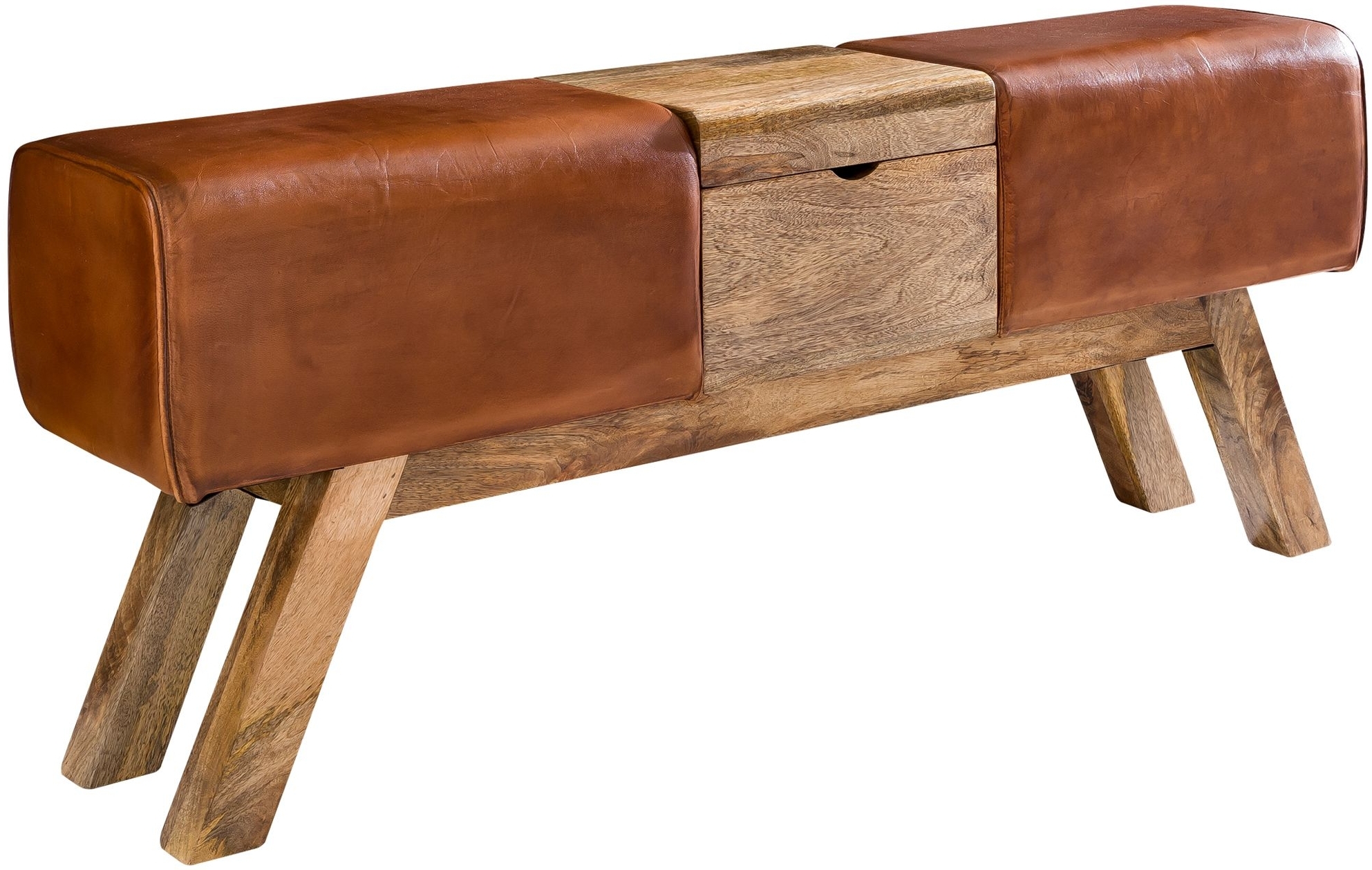 Design Turnbock Springbock Sitzbank mit brauner Echtleder-Sitzfläche und Holzbeinen, 120 x 29 x 53 cm. Sportliches Retro-Design mit massiven Holzbeinen. Handgefertigt, jedes Stück ein Unikat. Strapazierfähiges Echtleder und hohe Stabilität. Bodenschonende Anti-Rutsch Gumminoppen. **Highlights** - Retro-Design mit massiven Holzbeinen - Handgefertigt, jedes Stück ein Unikat - Strapazierfähiges Echtleder - Hohe Stabilität durch Massivholzbeine - Bodenschonende Anti-Rutsch Gumminoppen **Produkteigenschaften** - Abmessungen: Höhe 53 cm, Länge 120 cm, Tiefe 29 cm - Innenbox: Höhe 15,5 cm, Breite 26,5 cm, Tiefe 24,5 cm - Material: Sitzfläche aus 100 % echtem Leder, Beine & Box aus Mango Massivholz **Lieferumfang** - 1x Sitzbank ohne Dekoration Pflegehinweis: Mit feuchtem Tuch und mildem Reinigungsmittel abwischen, keine scharfen oder lösungsmittelhaltigen Reiniger verwenden.