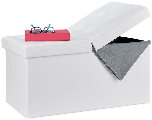 Die faltbare Relaxdays Sitzbank in Leder-Optik bietet mit ihren kompakten Maßen von 39 x 75 x 37 cm viel Stauraum und ist ideal für Flur, Schlafzimmer oder Kinderzimmer. Der klappbare Deckel ermöglicht einen einfachen Zugriff auf den Inhalt, während die gepolsterte Sitzfläche für angenehmen Komfort sorgt. Mit einer Belastbarkeit von bis zu 300 kg ist die Sitzbank stabil und platzsparend faltbar, wenn sie nicht benötigt wird. **Highlights** - Viel Stauraum für Flur, Wohn-, Schlaf- oder Kinderzimmer - Klappbarer Deckel für bequemen Zugriff - Gepolsterte Sitzfläche für angenehmen Sitzkomfort - Stabil und belastbar bis zu 300 kg - Platzsparend faltbar bei Nichtgebrauch **Produkteigenschaften** - Farbe: Weiß - Material: Kunstleder - Maße (HxBxT): 39 x 75 x 37 cm - Innenmaße (HxBxT): 34 x 73 x 34 cm - Volumen: ca. 84 L - Gewicht: ca. 6,1 kg - Traglast: bis zu 300 kg **Lieferumfang** - 1x faltbare Sitztruhe - Dekoartikel sind nicht im Lieferumfang enthalten