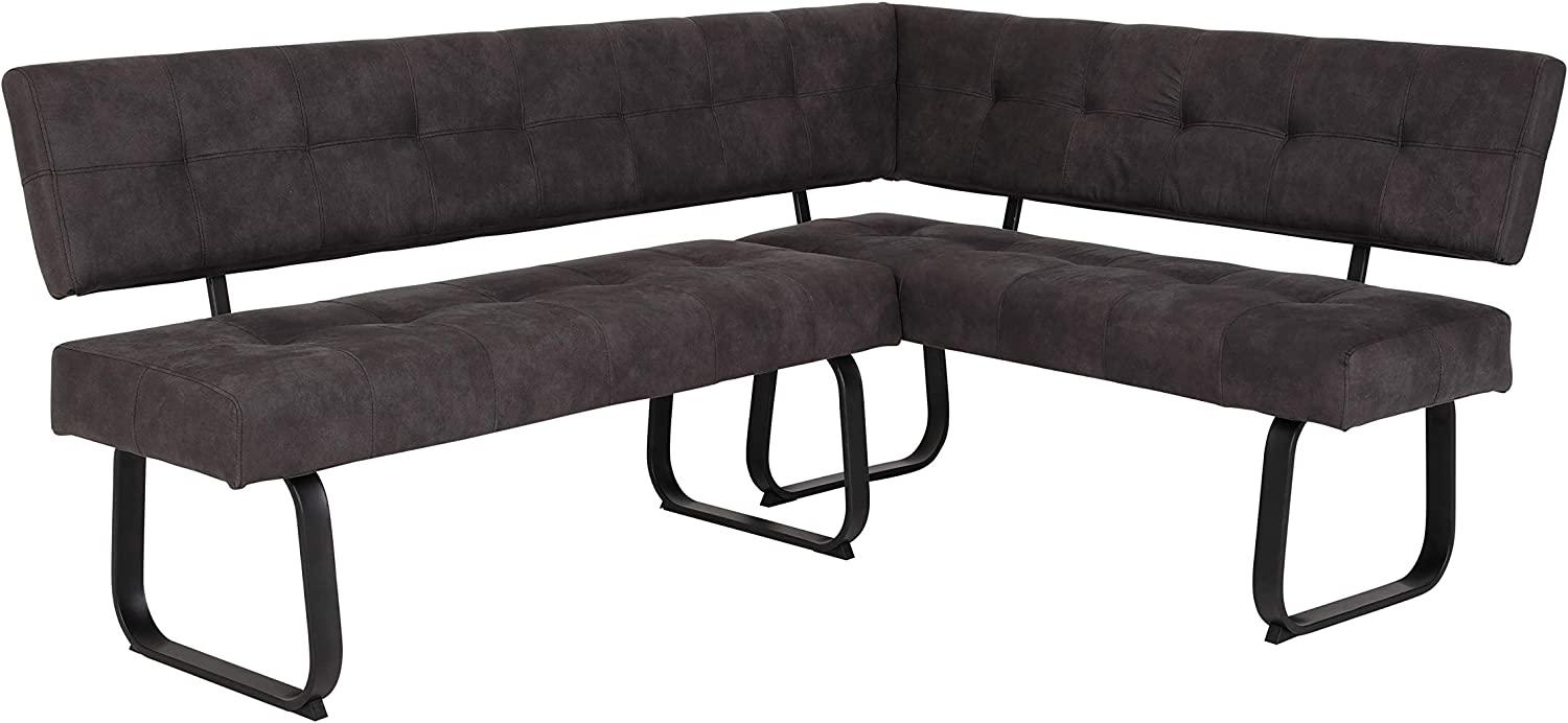 Die Eckbank Luise in Vintage Anthrazit besticht durch ihr Kufen-Metallgestell und den Bezug aus Microfaser. Mit einer festen Polsterung und einem Komfortsitz mit Federkorb bietet sie maximalen Sitzkomfort. Die Bank ist belastbar bis 300kg, jedoch maximal 120kg pro Person. Die Maße betragen: langer Schenkel 202cm, kurzer Schenkel 152cm, Höhe 92cm, Sitztiefe 46cm, Sitzhöhe 52cm und Gesamttiefe 65cm. **Highlights** - Kufen-Metallgestell für Stabilität - Bezug aus Microfaser Vintage Anthrazit für ein elegantes Aussehen - Komfortsitz mit Federkorb für extra Bequemlichkeit - Max. Belastbarkeit von 300kg für hohe Stabilität - Einfacher Aufbau dank übersichtlicher Anleitung **Produkteigenschaften** - Stoffzusammensetzung: 100% Polyester - Sitz fest gepolstert mit Steppung - Maße: langer Schenkel 202cm, kurzer Schenkel 152cm, Höhe 92cm, Sitztiefe 46cm, Sitzhöhe 52cm, Gesamttiefe 65cm **Lieferumfang** 1x Eckbank Luise - Anthrazit (zerlegt geliefert)