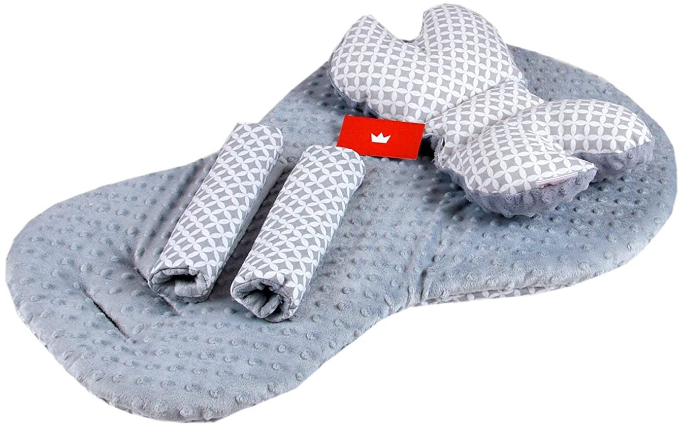 - Das Schmetterlingskissen sorgt für eine stabile Kopfhaltung und die Sitzeinlage hat Schlitze für die 3-Punkt-Gurte des Kinderwagens.