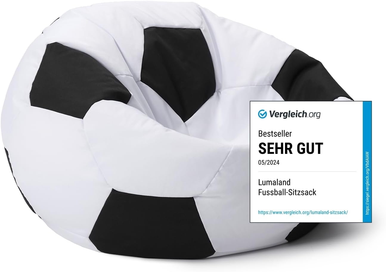 Entspannen Sie stilvoll mit dem Lumaland Fußball Sitzsack. Mit einem Durchmesser von 90 cm und einer Füllmenge von 170 Litern bietet er ausreichend Platz für Erwachsene und Kinder. Der Bezug aus hochwertigem, geruchsneutralem Material ist leicht zu reinigen und verfügt über einen zweiten Reißverschluss für einfaches Befüllen. Die Füllung mit original Lumaland premium EPS Perlen sorgt für Stabilität und Unterstützung von Rücken und Gelenken. Ein echter Blickfang für jede Fußball-Party! **Highlights** - Hochwertiges und geruchsneutrales Material - Top Verarbeitung mit extra starken Nähten - Für alle Altersklassen geeignet - Leicht zu reinigen und befüllen - Stabile und unterstützende Füllung mit original Lumaland premium EPS Perlen **Produkteigenschaften** - Abmessungen: Ø 90 cm - Füllmenge: 170 Liter - Farbe: Schwarz / Weiß - Material: Hochwertiges und geruchsneutrales Material - Verarbeitung: Top Verarbeitung mit extra starken Nähten - Geeignet für: Alle Altersklassen - Reinigung: Waschbarer Bezug mit zweitem Reißverschluss für einfaches Befüllen - Füllung: Original Lumaland premium EPS Perlen für Stabilität und Unterstützung von Rücken und Gelenken **Lieferumfang** - 1x Fußball Sitzsack (90 cm Ø) - 1x EPS Befüllung