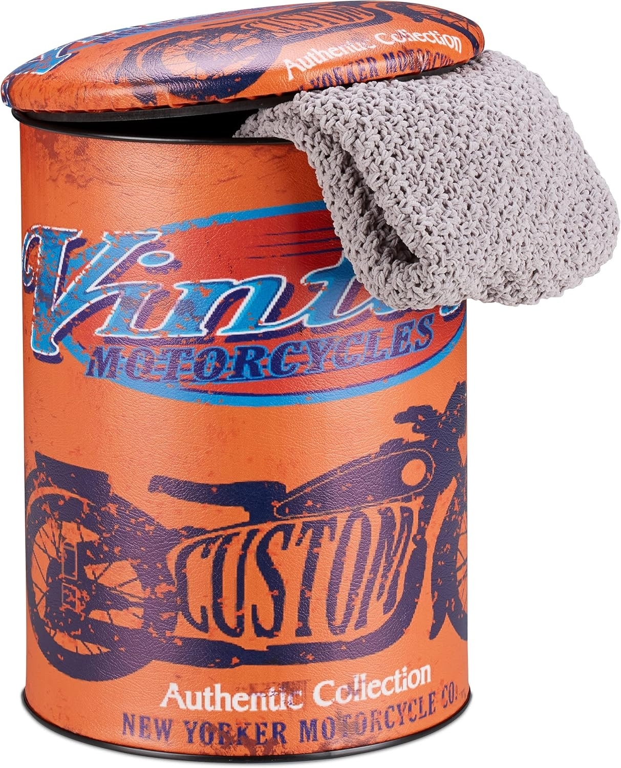 Die Relaxdays Sitztonne Vintage ist ein stilvoller Sitzhocker im Retro-Look mit einem bedruckten Stoffbezug im Shabby Style. Mit den Maßen von ca. 44 x 32 cm und einem leuchtenden Orange passt er ideal in jedes Wohnzimmer, Schlafzimmer oder Jugendzimmer. Der gepolsterte Deckel sorgt für komfortables Sitzen und bietet gleichzeitig viel Stauraum mit einem Fassungsvermögen von ca. 25 l. **Highlights** - Retro Sitztonne im Vintage Stil - Kultiges Motorrad-Motiv - Viel Stauraum im Inneren - Gepolsterter Deckel für bequemes Sitzen - Stabiles Metallmaterial **Produkteigenschaften** - Maße: H x D: ca. 44 x 32 cm - Farbe: Orange - Material: Metall, PVC - Fassungsvermögen: ca. 25 l - Abwischbarer Stoffbezug **Lieferumfang** - 1 x Relaxdays Sitztonne Vintage, orange