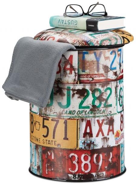 Die runde Sitztonne Vintage mit Motiv 10022868_470 ist ein stilvolles Möbelstück im Retro-Stil. Mit einem Durchmesser von 32 cm und einer Höhe von 44 cm bietet sie nicht nur eine bequeme Sitzgelegenheit, sondern auch ca. 25 Liter Stauraum für verschiedene Gegenstände. Der gepolsterte Deckel sorgt für zusätzlichen Komfort, während der Bezug aus abwischbarem PVC in Lederoptik die Pflege erleichtert. **Highlights** - Vintage Sitztonne mit bedrucktem Stoffbezug im Shabby Look - Bunte Collage aus US-Autokennzeichen für Reiselustige - Viel Stauraum im Inneren mit ca. 25 L Fassungsvermögen - Gepolsterter Deckel für bequemes Sitzen - Stabile Metallkonstruktion als belastbarer Sitz oder dekorativer Papierkorb **Produkteigenschaften** - Retro Design mit Autoschilder-Collage - Maße: 44 x 32 cm (H x D) - Bezug aus abwischbarem PVC in Lederoptik - Vielseitig einsetzbar für Wohnzimmer, Schlafzimmer und Jugendzimmer - Belastbarer Sitz für Kinder und Erwachsene