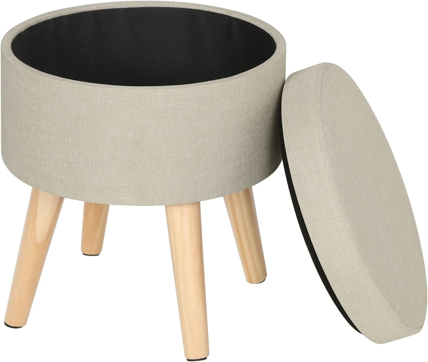 Ein gemütlicher Sitzhocker mit Stauraum aus Leinen in cremeweißem Design. Vielseitig einsetzbar als Sitzmöbel, Truhe oder Aufbewahrungsbox, sogar für den Outdoor-Bereich geeignet. Stabil dank robustem MDF-Rahmen und Massivholz-Fußgestell. Leicht zu montieren. Perfekte Ergänzung für jedes Zuhause. **Highlights** - Praktischer Stauraum für kleine Dinge - Gut gepolsterte Sitzfläche aus Leinen - Robuster Rahmen aus MDF Faserplatte (Klasse E1) - Bodenschoner unter den Fußgestellen - Einfache und schnelle Montage **Produkteigenschaften** - Material: Leinen, Massivholz, MDF (E1 Klasse) - Maße: Ø Sitzfläche ca. 32 cm, Höhe: 36 cm - Fassungsvermögen: 8 Liter - Gewicht: 3 kg (Netto) - Maximale Belastung: 150 kg - Farben: Kaffee, Dunkelgrau, Hellbraun, Hellgrau, Cremeweiß **Lieferumfang** - 1 x Sitzhocker