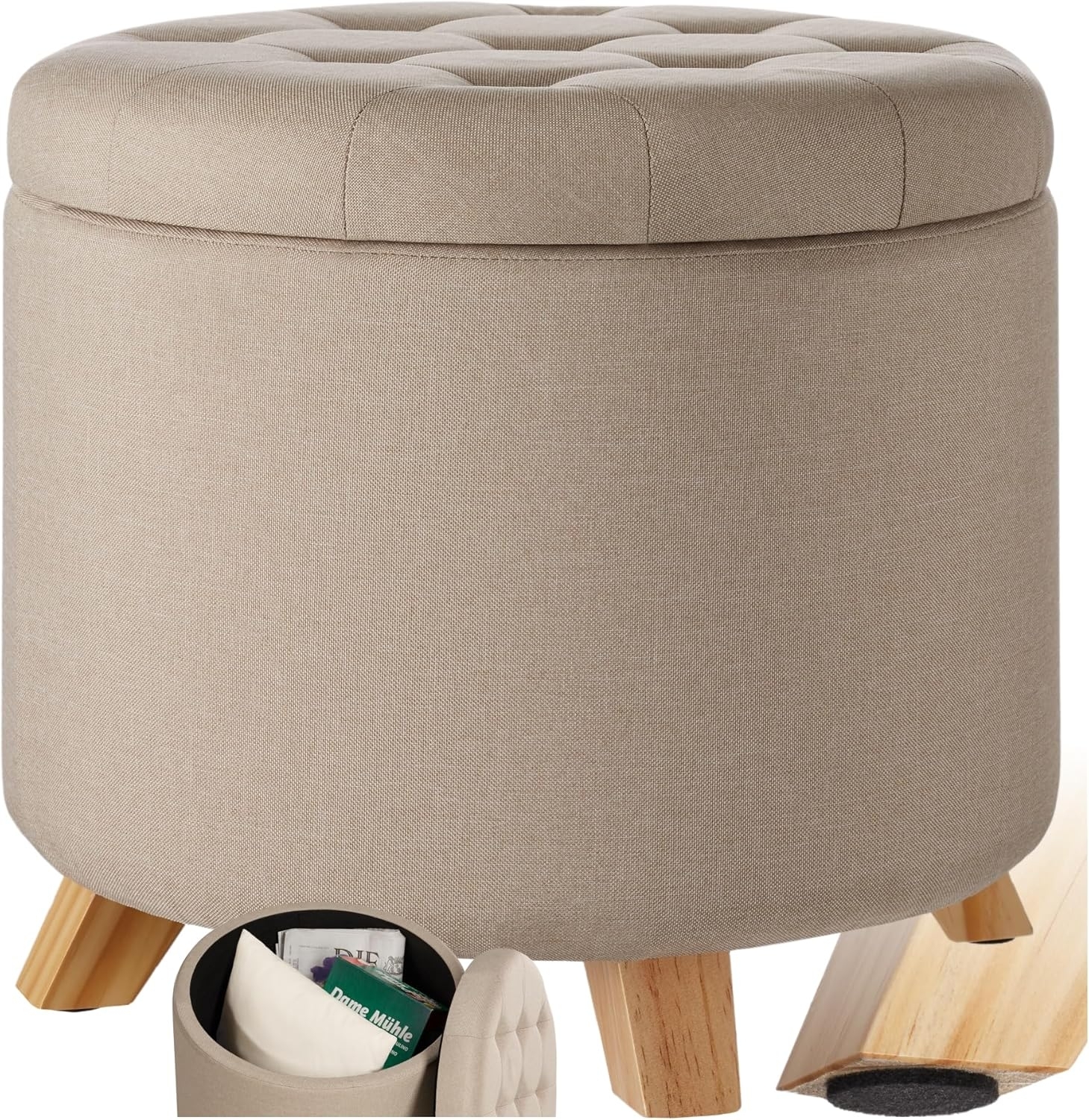 Der stilvolle Sitzhocker Suna von tectake vereint ansprechendes Design mit praktischer Funktionalität. Mit einem Durchmesser von ca. 44,5 cm und einer Höhe von ca. 41,5 cm bietet er nicht nur einen gemütlichen Sitzplatz, sondern auch ein geräumiges Staufach mit einem Volumen von ca. 32,5 l. Die stabile Holzkonstruktion und die weiche Polsterung garantieren hohen Sitzkomfort und eine Belastbarkeit von bis zu 150 kg. **Highlights** - Geräumiges Staufach für Spielzeug oder Alltagsgegenstände - Stabile Holzkonstruktion mit massiven Kiefernholzbeinen - Gesteppte Oberseite für ein gemütliches Flair - Hohe Belastbarkeit von 150 kg - Pflegeleichter Bezug für den täglichen Gebrauch **Produkteigenschaften** - Totalmaße (ØxH): ca. 44,5 x 41,5 cm - Dicke des Polsters: ca. 5 cm - Maße Staufach (ØxH): ca. 39,5 x 26,5 cm - Höhe der Beine: ca. 6,5 cm - Gewicht: ca. 5,9 kg - Material: MDF-Platte, Polyurethan, Kiefer, 100 % Polyester **Lieferumfang** - Sitzhocker mit Staufach