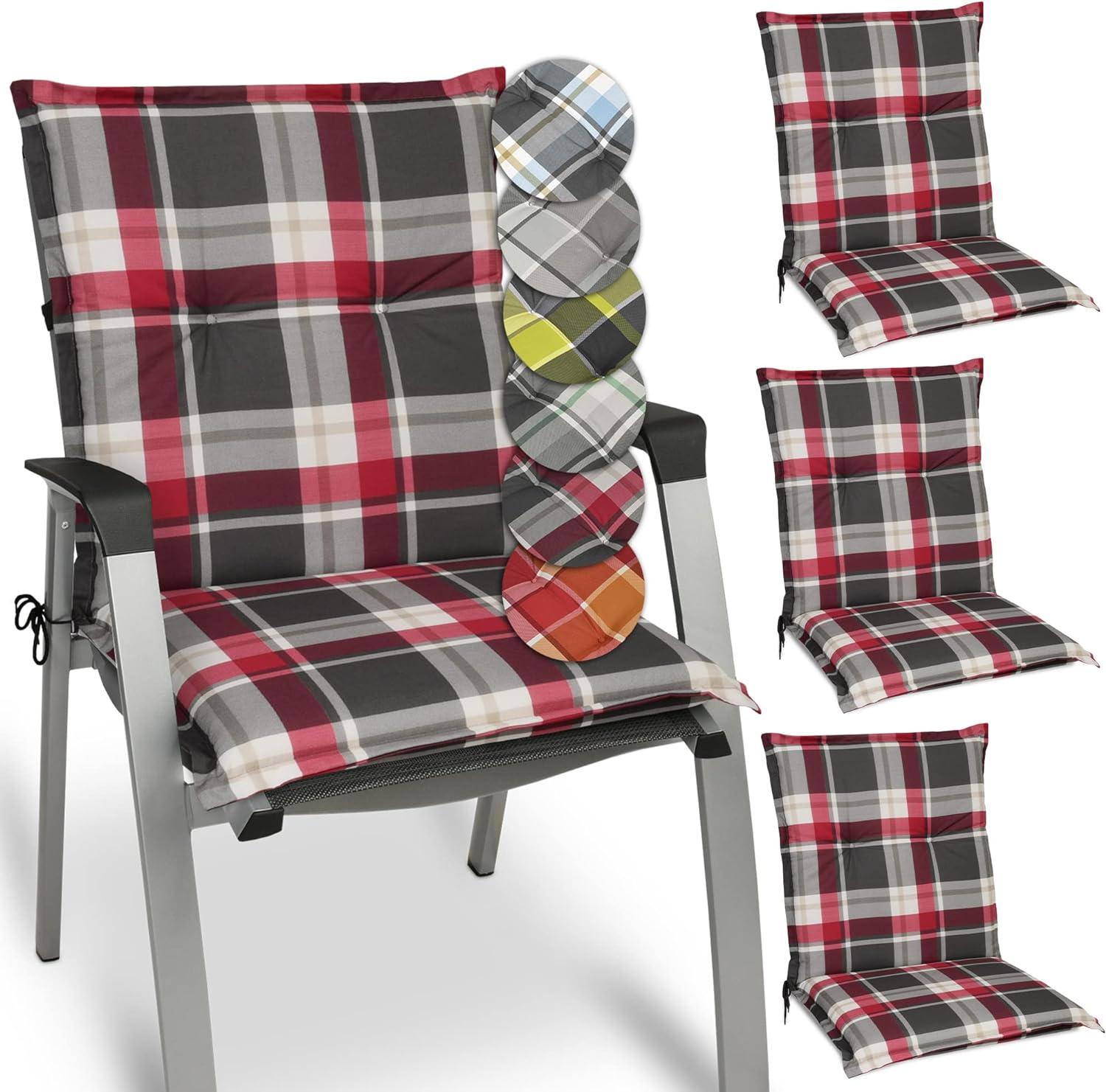 Die Beautissu 4er Set Niedriglehner Auflagen Sunny 100 x 50 x 6 cm Bordeaux bieten einen hohen Sitzkomfort dank der weichen Schaumkernfüllung. Mit dem Befestigungsband auf der Rückseite und den Befestigungsschnüren links und rechts lässt sich die Auflage einfach fixieren. Die Polster haben eine UV Lichtechtheit von 5 und bestehen aus 40% Baumwolle und 60% Polyester. Verschönern Sie Ihre Gartenmöbel mit diesen Auflagen und genießen Sie ein tolles Sitzvergnügen. Die Maße der Auflage betragen ca. 100 x 50 x 6 cm, die Sitzfläche ist ca. 50x50 cm groß und das Rückenpolster hat ebenfalls die Maße 50x50 cm. **Highlights** - Hoher Sitzkomfort dank weicher Schaumkernfüllung - Einfache Befestigung mit Befestigungsband und Schnüren - UV Lichtechtheit 5 für langanhaltende Farbechtheit - Aus 40% Baumwolle und 60% Polyester für angenehmes Sitzen - Passend für die meisten Niedriglehner Gartenstühle und Multifunktions-Sessel **Produkteigenschaften** - Maße der Auflage: ca. 100 x 50 x 6 cm - Maße der Sitzfläche: ca. 50x50 cm - Maße des Rückenpolsters: ca. 50x50 cm **Lieferumfang** - 4x Niedriglehner Auflage Sunny 100 x 50 x 6 cm Bordeaux