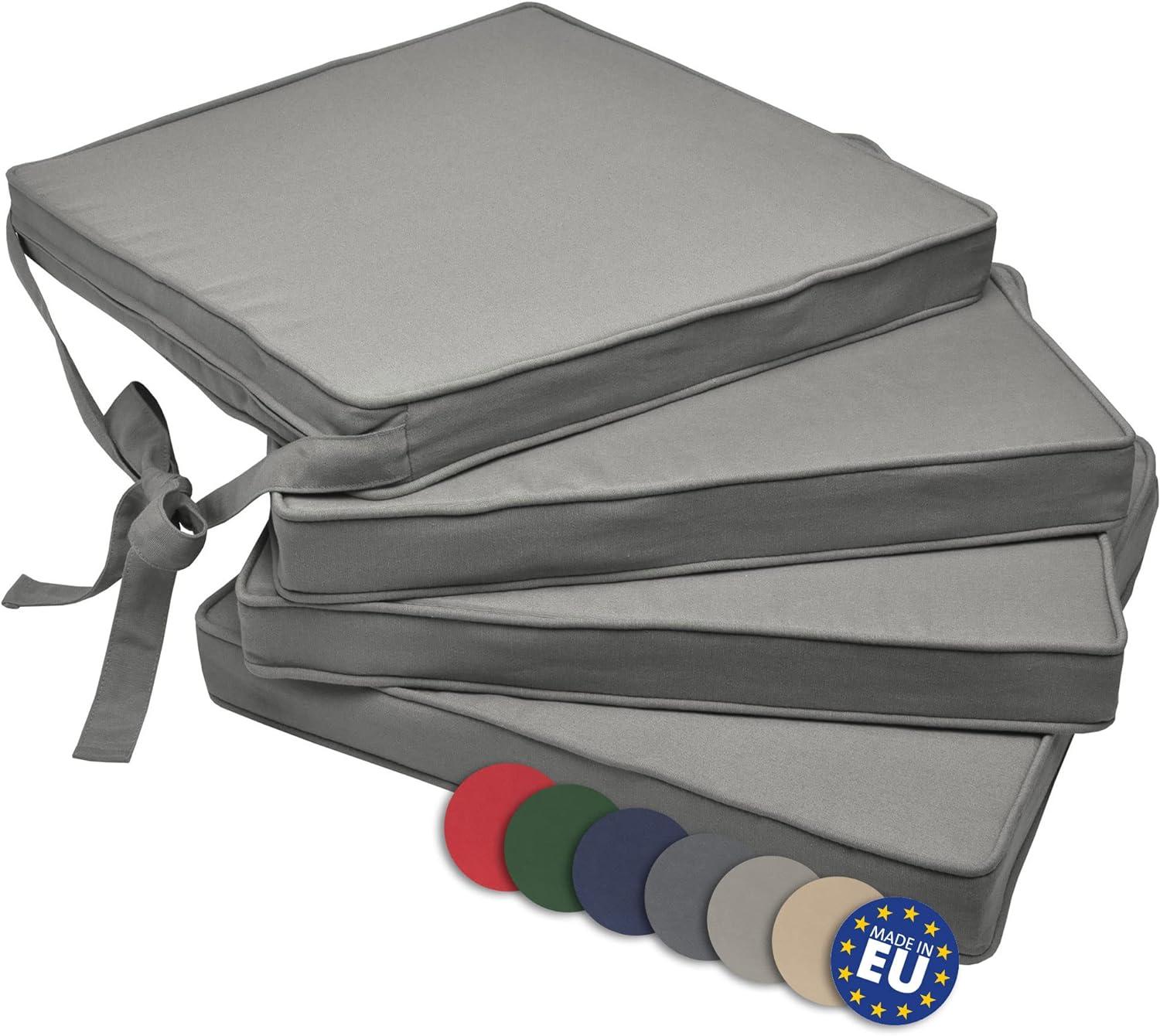 | Beschreibung | Verwandeln Sie Ihre Stühle im Handumdrehen in bequeme Sitzgelegenheiten mit dem 4er Set Stuhlkissen Loft SK von Beautissu. Die Kissen verfügen über abnehmbare Bezüge, die bei bis zu 30°C gewaschen werden können. Mit einer Stoffqualität von 220 g/m² und einer Füllung aus Polyurethan-Schaum bieten sie hohen Komfort. Zwei Befestigungsbänder von jeweils 70 cm Länge sorgen für sicheren Halt. Bitte beachten Sie, dass die Kissen nur bedingt outdoor-geeignet sind. **Highlights** - Verwandeln Sie Ihre Stühle in bequeme Sitzgelegenheiten - Abnehmbarer Bezug für einfache Reinigung - Hochwertige Stoffqualität von 220 g/m² - Füllung aus bequemem Polyurethan-Schaum - Zwei Befestigungsbänder für sicheren Halt **Produkteigenschaften** - Maße: vorne ca. 45 cm Breite, hinten ca. 40 cm Breite, 40 cm Tiefe, 5 cm Höhe - Stoffqualität: 220 g/m² - Füllung: Polyurethan-Schaum mit einer Dichte von 25 kg/m³ - Abnehmbarer Bezug, waschbar bei bis zu 30°C - Zwei Befestigungsbänder von jeweils 70 cm Länge - OEKO-TEX Zertifikat mit der Nummer A08-0389 - Hergestellt in der EU, 100% Polyester **Lieferumfang** - 4er Set Stuhlkissen Loft SK Hellgrau |