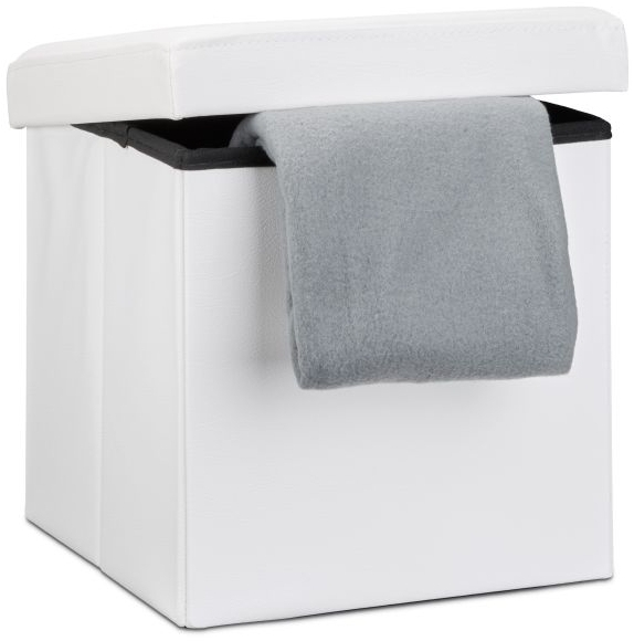Der faltbare Sitzhocker aus Kunstleder in Weiß vereint Funktionalität und Stil. Mit einem Fassungsvermögen von ca. 40 L bietet er ausreichend Stauraum für verschiedene Gegenstände. Die stabile Konstruktion mit einer zusätzlichen MDF Platte sorgt für eine Belastbarkeit von bis zu 300 kg. Der weiche Polster sorgt für ein angenehmes Sitzgefühl, während der Hocker bei Nichtgebrauch platzsparend zusammengefaltet werden kann. **Highlights** - Viel Stauraum: ca. 40 L Fassungsvermögen für CD’s, Bücher und mehr - Stabile Sitzgelegenheit: Robust verbaut und bis 300 kg belastbar - Weiches Polster: Angenehmes Sitzgefühl auch bei längerer Nutzung - Platzsparend: Faltbar und leicht zu verstauen - Vielseitig einsetzbar: Für Wohnzimmer, Kinderzimmer, Gästezimmer oder Flur **Produkteigenschaften** - Maße: 38 x 38 x 38 cm (aufgebaut), 6 x 38 x 38 cm (zusammengefaltet) - Material: Kunstleder - Farbe: Weiß - Stabile Konstruktion mit zusätzlicher MDF Platte - Belastbarkeit: bis 300 kg - Weiche und belastbare Oberfläche - Gewicht: ca. 2,5 kg **Lieferumfang** - Hocker gefaltet - Extra Deckel - Bodenplatte - Dekorationsartikel sind im Lieferumfang nicht enthalten