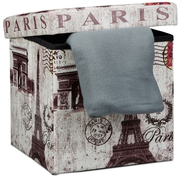 Der Sitzhocker mit trendigem Paris-Motiv aus bedrucktem Kunstleder vereint Funktionalität und Stil. Mit einem Stauraum von ca. 40 L bietet er ausreichend Platz für Zeitschriften, Spielzeug und mehr. Der Hocker ist belastbar bis 300 kg und verfügt über eine zusätzliche MDF-Platte für Stabilität. Er lässt sich platzsparend zusammenfalten und ist vielseitig einsetzbar im Wohnzimmer, Kinderzimmer oder Flur. **Highlights** - Viel Stauraum: Mit ca. 40 L Fassungsvermögen - Stabile Sitzgelegenheit: Belastbar bis 300 kg - Trendiges Design: Mit bedrucktem Kunstleder und Paris-Motiv - Platzsparend: Zusammenklappbar bei Nichtgebrauch - Vielseitig einsetzbar: Für Wohnzimmer, Kinderzimmer, Gästezimmer oder Flur **Produkteigenschaften** - Maße aufgebaut: 38 x 38 x 38 cm - Maße zusammengefaltet: 6 x 38 x 38 cm - Material: Kunstleder - Stauraum: ca. 40 L - Gewicht: ca. 2,5 kg - Belastbarkeit: bis 300 kg **Lieferumfang** - Hocker gefaltet - Extra Deckel - Bodenplatte - Dekorationsartikel sind im Lieferumfang nicht enthalten