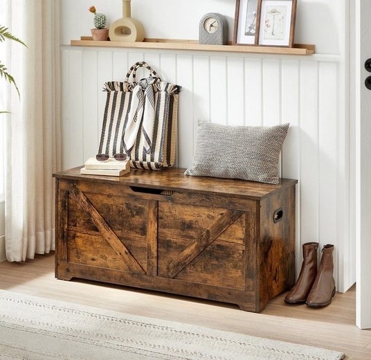 **VASAGLE Aufbewahrungsschrank** Vintage-Flair: Die rustikale braune Farbe der Schuhbank passt perfekt zu einem traditionellen Dekor, das zeitlos und somit immer beliebt ist. Das einzigartige Design bringt den Landhausstil in Ihr Zuhause. Mehr Stauraum: Öffnen Sie den Deckel – Der geräumige Innenraum (100 x 40 x 46 cm) bietet viel Platz für Kleidung und Spielzeug. Dank der beiden Scharniere mit stufenloser Haltefunktion besteht keine Gefahr, dass Ihre Finger eingeklemmt werden könnten. Leicht zu bewegen: Mithilfe der beiden praktischen Griffe an den Seiten können Sie diesen Aufbewahrungsschrank dorthin bewegen, wo Sie ihn brauchen, zum Beispiel im Flur, im Kinderzimmer oder im Wohnzimmer. Nehmen Sie bitte Platz: Diese Sitztruhe ist aus robustem Holzspan gefertigt und bis zu 100 kg belastbar. So können Sie sich hinsetzen, um Ihre Schuhe in aller Ruhe an- oder auszuziehen. Was Sie bekommen: Eine Spielzeugtruhe mit geräumigem Stauraum – dazu eine klare Anleitung und gekennzeichnete Einzelteile für eine schnelle und mühelose Montage.