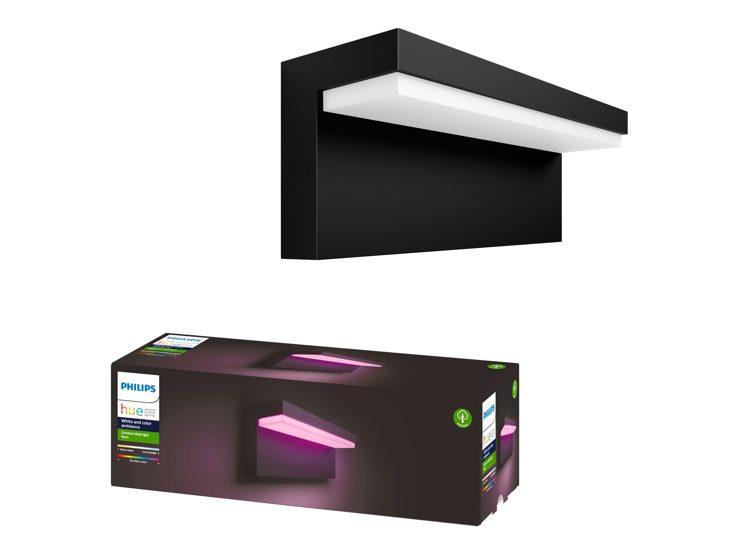 - Die Philips Hue White and Color Ambiance LED Außenwandleuchte Nyro bietet bis zu 16 Millionen Farben für eine individuelle Lichtgestaltung.