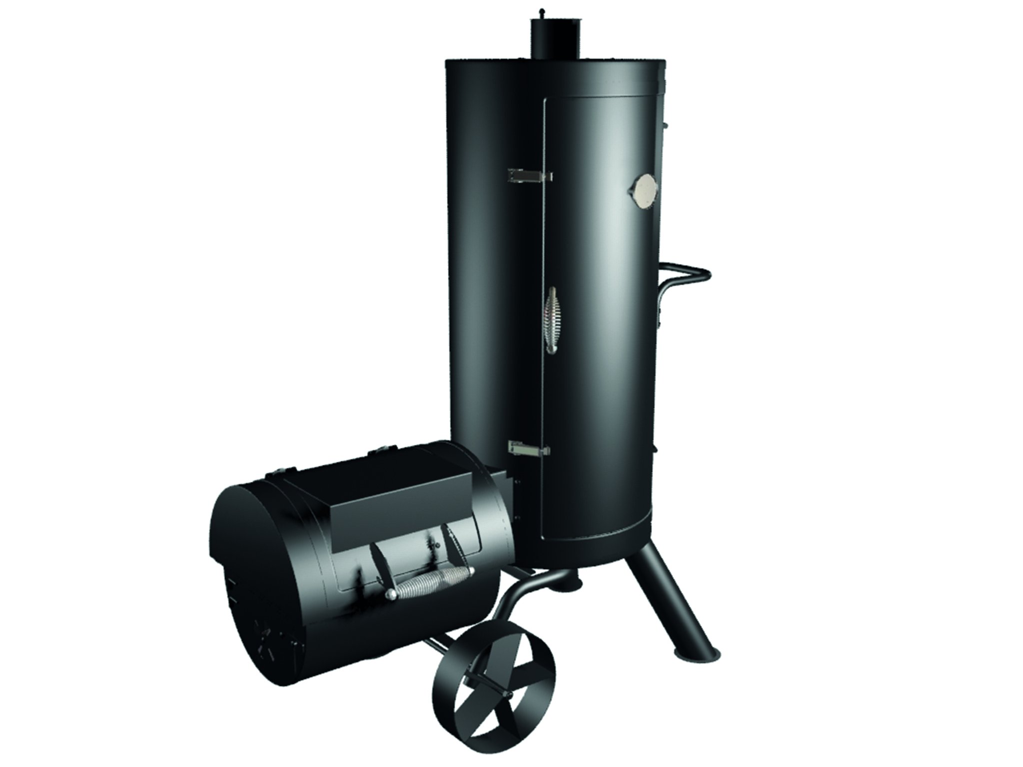 | Ausstattung | mit Schale für Räucherspäne, mit Fischgitter, regelbare Luftzufuhr, Aufhängehaken im Räucherfass, mit Thermometer, mit Deckel, mit Rädern |