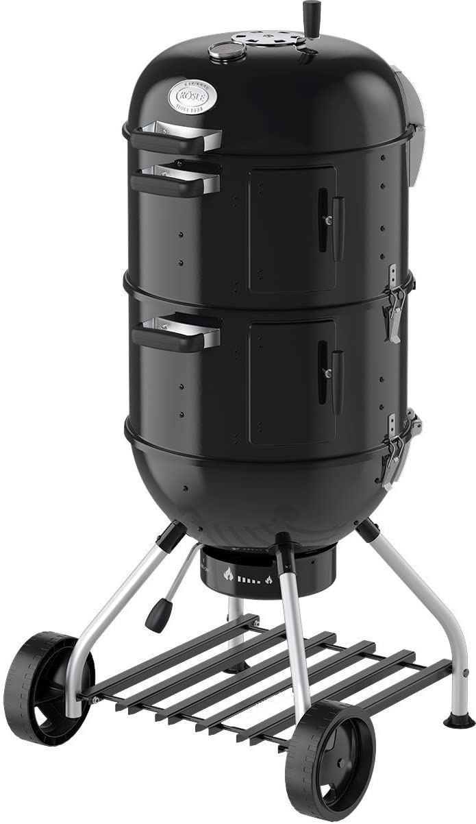 RÖSLE Smoker No. 1 F50-SStahl schwarz, 69 x 68 x 136 cm, als Holzkohlegrill verwendbar, Deckelscharnier, integrierter Wasserbehälter (7 l) für gleichbleibende Temperatur