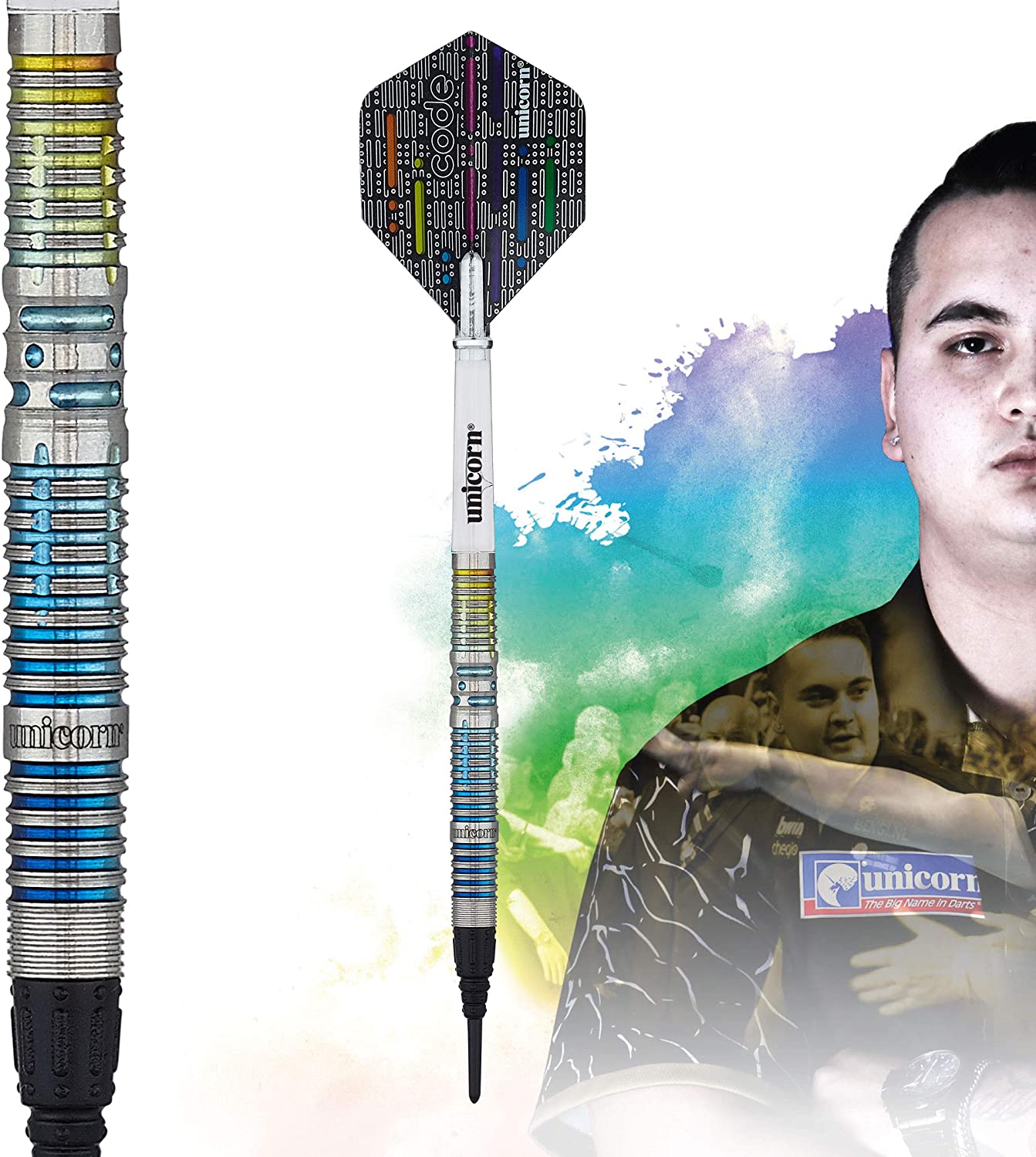 - Der Unicorn Jeffrey de Zwaan Code Players Soft Dart besteht aus hochwertigem 90% Tungsten, was für eine hohe Haltbarkeit und Präzision sorgt.
