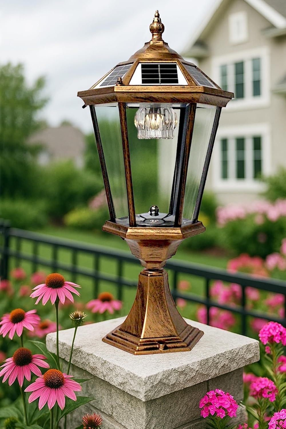 **Klassische Gartenleuchte Solarbetrieben 52 x 24 cm** **Kabellos, Duo Color (warmweiß oder kaltweiß per Schalter einstellbar)** **Power Solar-Gartenleuchte** Diese Art Solarleuchten ist nicht zu verwechseln mit herkömmlichen Solarlampen aus dem Baumarkt. Die Lampe verfügt über 6 Solarpanele mit einer gesamtleistung von **2,4 W** und wird mit **18** leuchtstarken SMD LED',s betrieben. **Duo Color:** * An der Gartenleuchte befindet sich ein Schalter, an dem Sie zwischen kaltweißer oder warmweißer Beleuchtung wählen können. **Starker Akku:** * Der hochwertige Akku hat eine Spannung von 3,7V und eine Kapazität von 2000 mAh. Zusätzlich ist die Lampe mit einem Dämmerungssensor ausgestattet, der das Ein- und Ausschalten der Lampe bei Dämmerung automatisch steuert. **Die elegante und bequeme Art den Garten zu Beleuchten:** * Diese Gartenlaterne wird ausschließlich durch Sonnenenergie betrieben. **Keine Stromkosten**, **keine Kabelverlegung!** Die Lampe wird lediglich am Fuß mit zwei Befestigungsschrauben (im Lieferumfang enthalten) fixiert und ist dann direkt einsatzbereit. Das wetterfeste Material (Aluminium und Glas) rundet die Funktionalität der Leuchte ab. Geeignet für jede Jahreszeit! Es werden in etwa 5-6 Stunden Tageslicht benötigt, um eine Leuchtdauer von 10 - 12 Stunden zu erreichen. **Daten und Maße:** * **Höhe:** 52 cm * **Durchmesser:** 24 cm * **Maße Sockel:** 16 cm x 16 cm * **Solarpanel:** Polysilicon 6V/2,4W * **Akku:** 18650 Lithium 3.7V/2000mAh * **LED:** SMD2835 18 PCS, 2W bi-color (warmweiß und kaltweiß einstellbar) * **Lumen:** 190LM * **Leuchtzeit:** ca. 10-12 Std * **Ladezeit:** ca. 5-6 Std * **Automatischer Dämmerungssensor** * **IP:** IP65 * **Material:** Aluminium +, Glas * **Farbe:** Kupferfarben / Bronzefarben * **Befestigung:** 2x Einschlagdübel mit Mutter und Unterlegscheibe