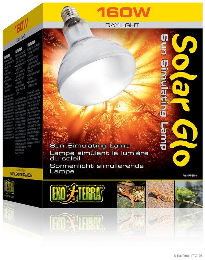 - Die Exo Terra Solar Glo ist eine selbstbalancierende Quecksilberdampflampe, die die Vorteile von natürlichem Sonnenlicht für Reptilien bietet