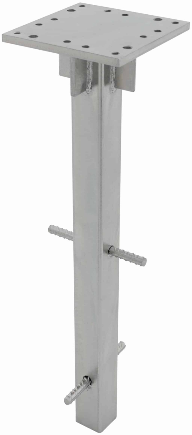 - Er wird im Erdreich einbetoniert, wodurch keine extra Adapterplatte für die Montage benötigt wird.