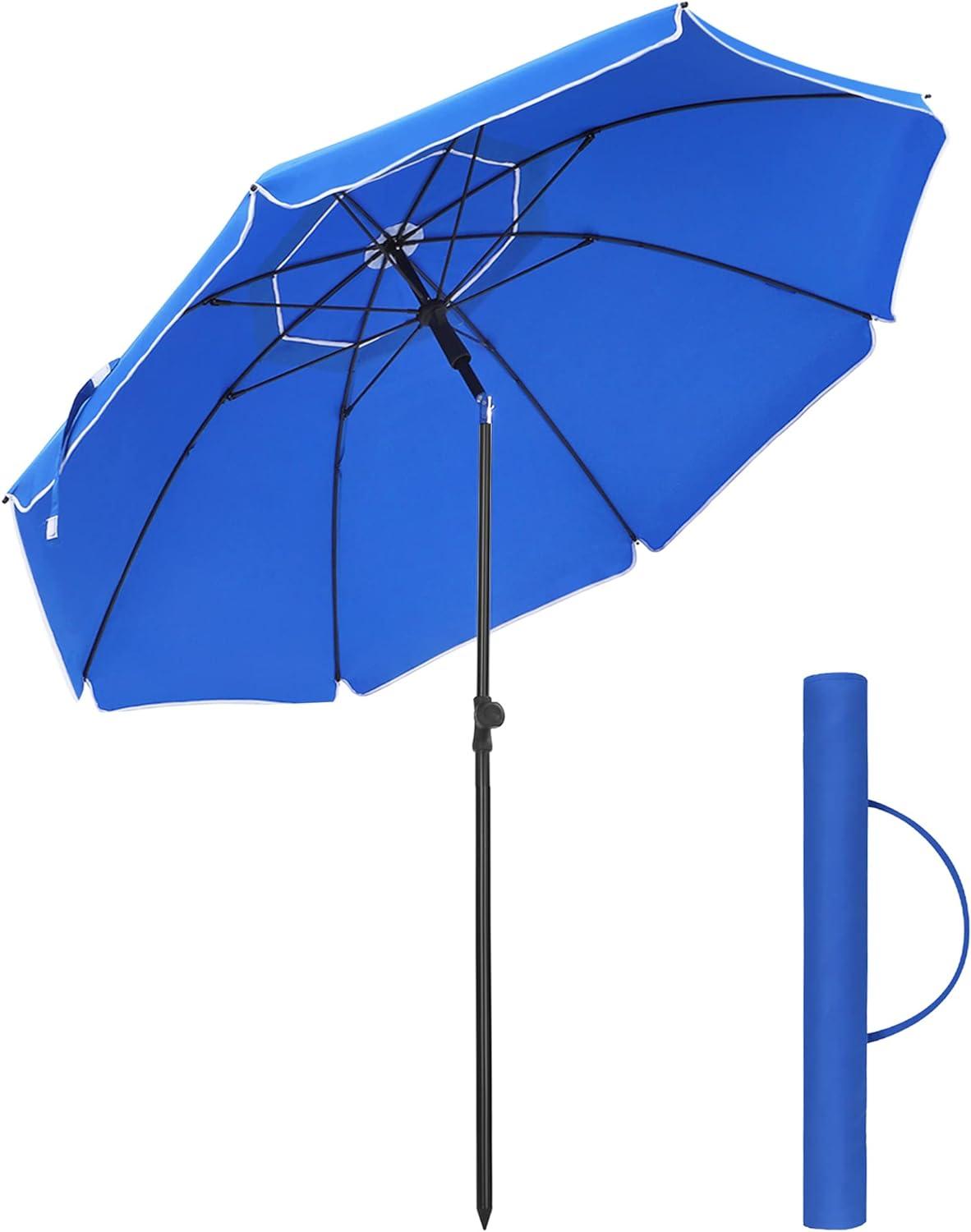 Der Sonnenschirm für den Strand bietet optimalen UV-Schutz bis UPF 50+ und schützt Sie vor mehr als 98% der UV-Strahlen. Mit einem Durchmesser von 200 cm und einer Wölbung von 220 cm sorgt er für ausreichend Schatten. Der Schirm ist um 60 cm höhenverstellbar und beidseitig um 30° knickbar. Dank der robusten Rippen aus Glasfaser und des stabilen Stahlmasts ist er windresistent. Er lässt sich leicht abbauen und in der Tragetasche transportieren. **Highlights** - Höhenverstellbar: Der Schirm ist um 60 cm in der Höhe verstellbar. - Beidseitig um 30° knickbar: Drücken Sie auf den Knopf am Gelenk, um den Strandschirm zu kippen. - Ausgezeichneter Sonnenschutz: Der Terrassenschirm mit UPF 50+ hält mehr als 98% der UV-Strahlen ab. - Resistent gegen Nieselregen: Das Schirmtuch besteht aus 160 g/m² Polyester mit PA-Beschichtung. - Tragbar: Der Gartenschirm lässt sich leicht abbauen, in der mitgelieferten Tragetasche verstauen und transportieren. **Produkteigenschaften** - Farbe: Blau - Material: Schirmmast aus Stahl, Rippen aus Glasfaser, Schirmtuch aus 160 g/m² Polyestergewebe - Höhe im aufrechten Zustand: 158-218 cm - Horizontal-Durchmesser des Schirmtuchs: 200 cm - Ø Schirmmast: Oberer Teil 22 mm / unterer Teil 25 mm - Gewicht: 2,4 kg **Lieferumfang** - 1 x Sonnenschirm - 1 x Transporttasche - Ein Schirmständer wird nicht mitgeliefert.