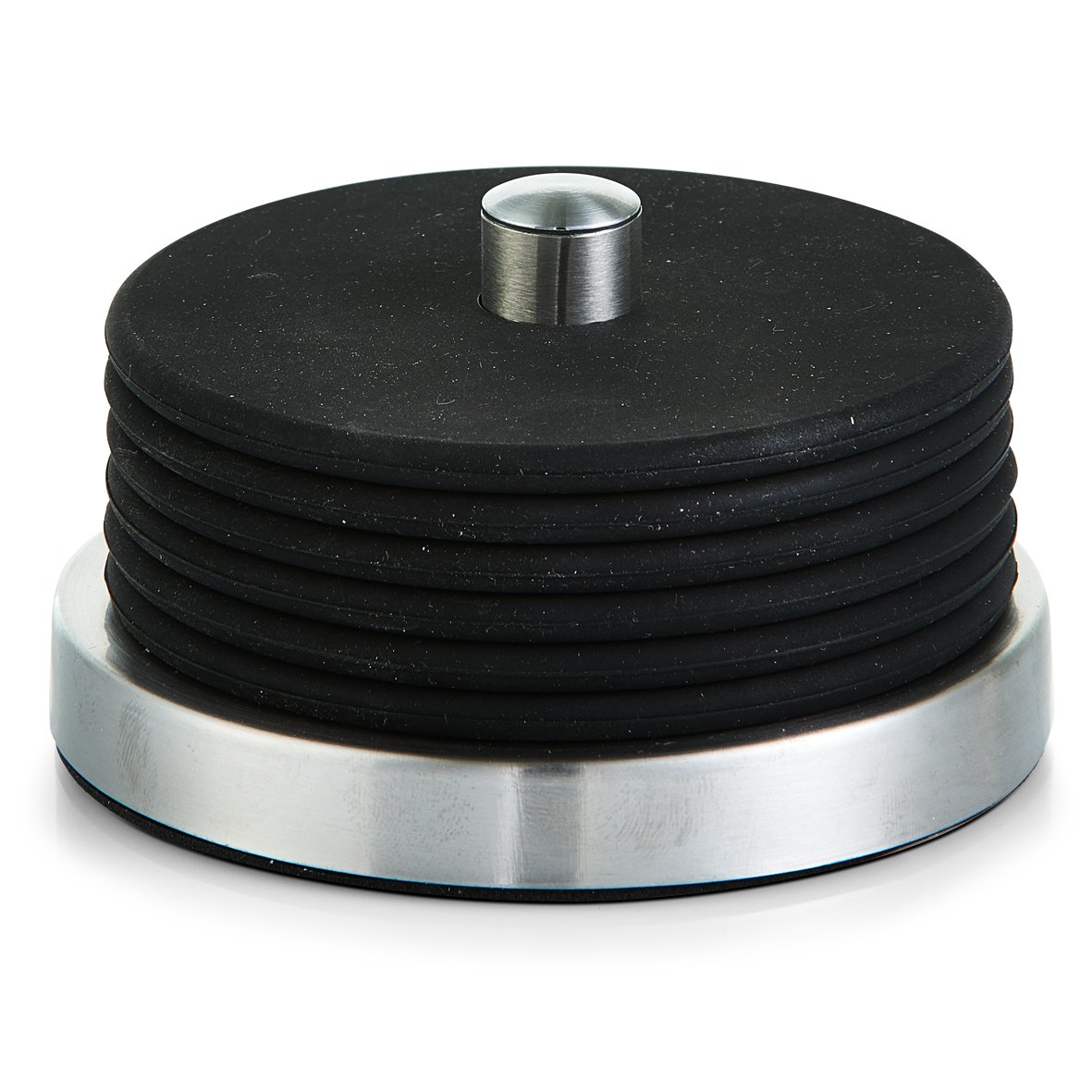 - Das Set besteht aus sechs Untersetzern und einem Ständer, gefertigt aus Edelstahl und Silikon.