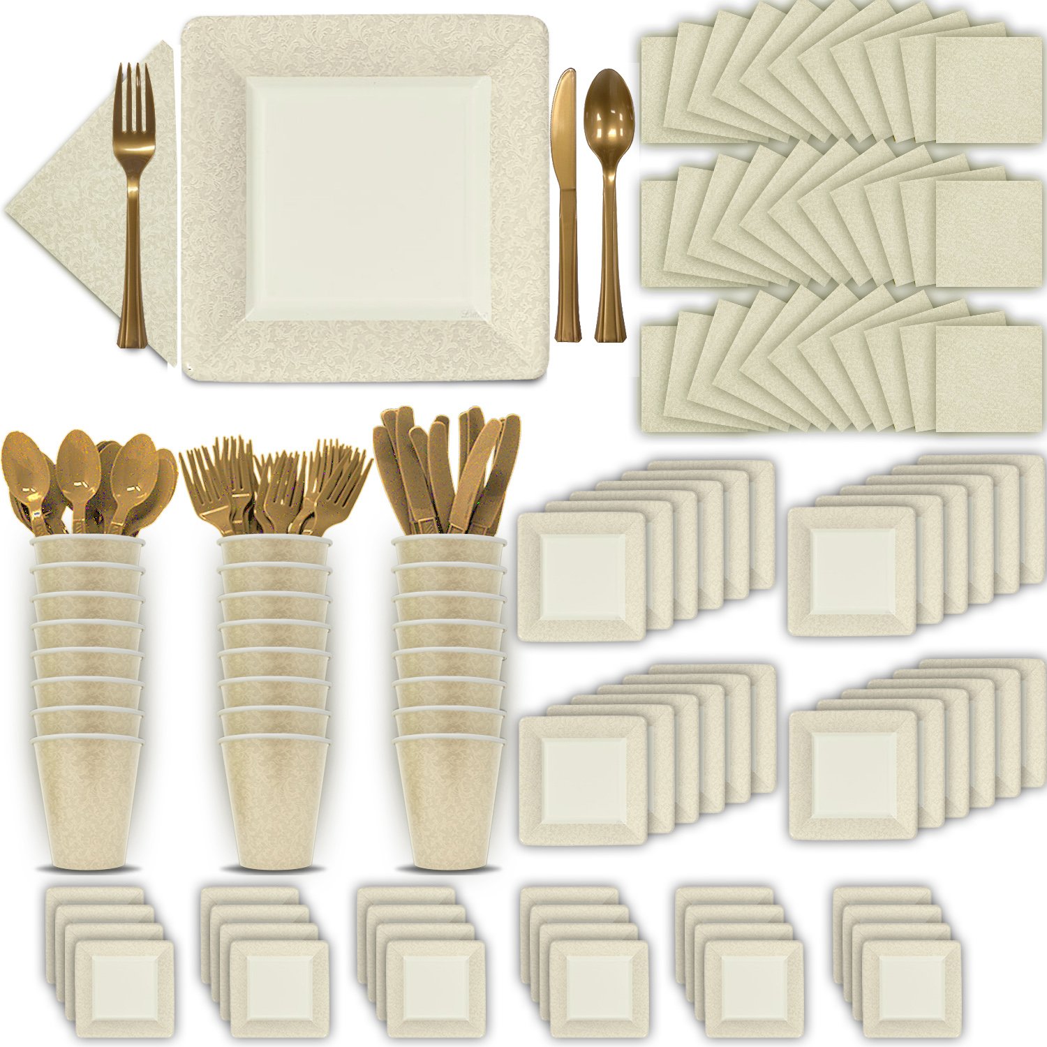 Fancy Einweg Elfenbeinfarben (cremefarben) Geschirr Set - 24 Gäste - 2 Größe ECKIG Teller, Tassen, Servietten, Löffeln, Gabeln, Messer - Made Schweres Papier - Posh, Arztausstattung, elegantes Design für gehobenen Party