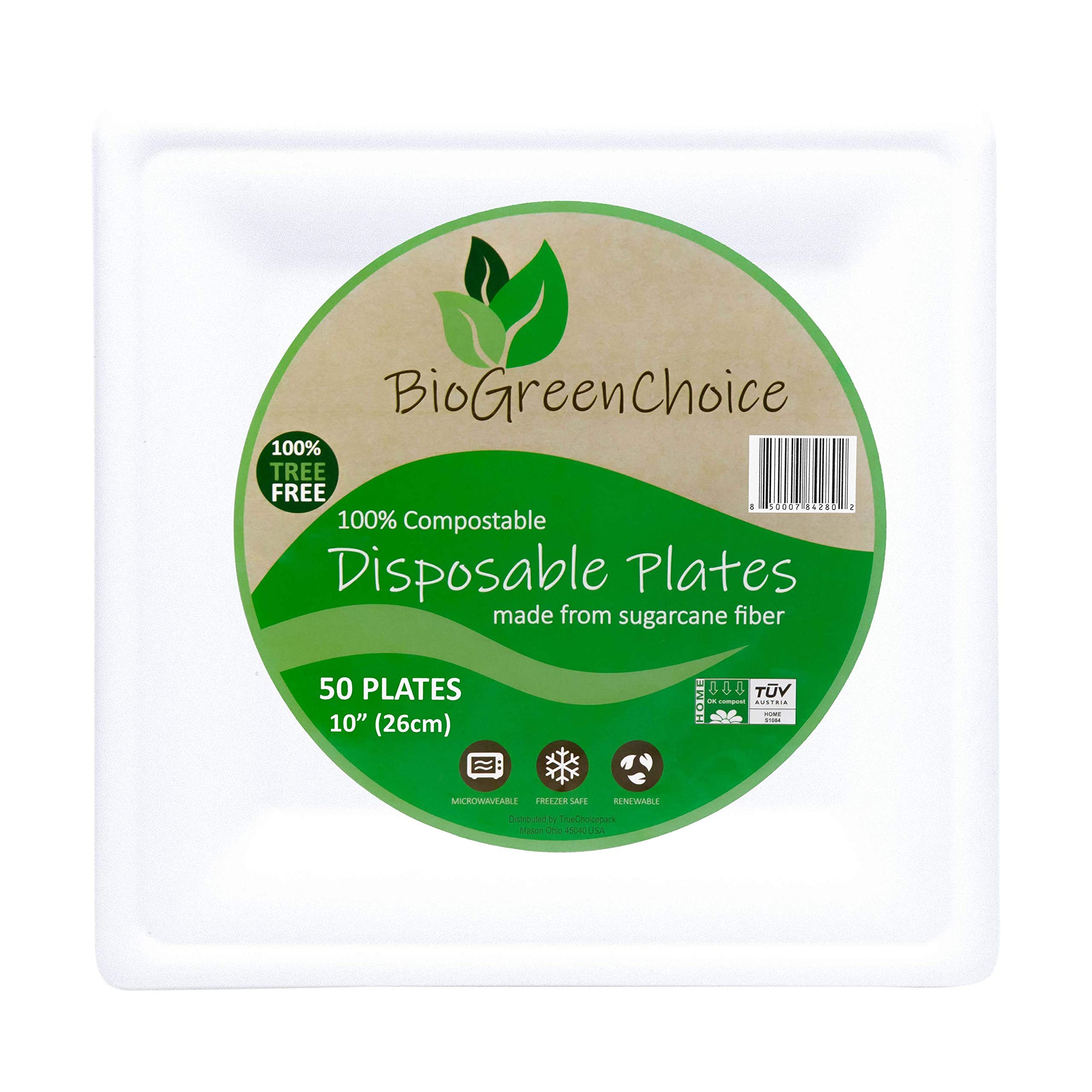 BioGreenChoice 25,4 cm Kompostierbare Fiber-Molded Bagasse-Naturzuckerrohr Einwegtellerquadratisch, mikrowellenfest, biologisch abbaubar & kompostierbar 50 Count weiß