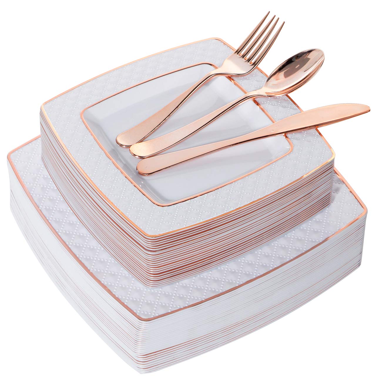 75-teilige goldfarbene Kunststofftellerweiße Teller mit goldfarbenem Rand, quadratische Einwegteller, elegantes Einweg-Teller, 24,1 cm, 25 Salatteller 19,1 cm, 25 Dessertteller 16,5 cm disposable rose gold dinnerware set