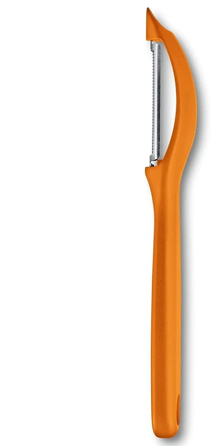 Der VICTORINOX Universalschäler mit Zackenschliff in Orange ist das ideale Werkzeug für die einfache und präzise Verarbeitung von Obst und Gemüse mit weicher oder harter Schale. Die extra scharfe Zackenschliffklinge und der ergonomische Griff aus Polypropylen (PP) sorgen für eine mühelose Handhabung und Freude beim Kochen. Zudem ist der Schäler spülmaschinengeeignet und rostfrei, was die Reinigung erleichtert. **Highlights** - Extra scharfer Zackenschliff für feste Schalen - Ergonomischer Griff für einfache Handhabung - Spülmaschinengeeignet für einfache Reinigung - Hochwertige, rostfreie Klinge für Präzision und Stabilität - Leichtes Gewicht von nur 21 g **Produkteigenschaften** - Abmessungen: 175 mm lang × 21 mm breit × 20 mm hoch - Gewicht: 21 g - Material: Polypropylen (PP) - Farbe: Orange - Artikelnummer: 7.6075.9 - Klingeneigenschaften: zweischneidig