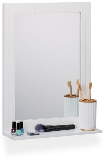 Moderner Badspiegel mit Ablage in rechteckigem Design und weißem Rahmen. Die praktische Ablage bietet Platz für Zahnputzbecher, Kosmetik oder Dekoartikel. Mit den Maßen 55 x 40 x 12 cm und einer Ablagefläche von 40 x 10,5 cm ist dieser Spiegel ideal für Badezimmer, Gäste-WC und Flur. Hergestellt aus Glas und MDF, überzeugt er durch Funktionalität und ansprechendes Design. **Highlights** - Modernes Design mit weißem Rahmen - Praktische Ablage für verschiedene Utensilien - Vielseitig kombinierbar mit verschiedenen Einrichtungsstilen - Geeignet für Badezimmer, Gäste-WC und Flur - Einfache vertikale Wandmontage **Produkteigenschaften** - Maße (HxBxT): 55 x 40 x 12 cm - Ablagefläche: 40 x 10,5 cm - Gewicht: ca. 2,7 kg - Traglast: ca. 5 kg - Material: Glas, MDF - Farbe: Weiß **Lieferumfang** - 1x Badspiegel in Einzelteilen - Anleitung und Montagematerial - Dekoartikel nicht im Lieferumfang enthalten