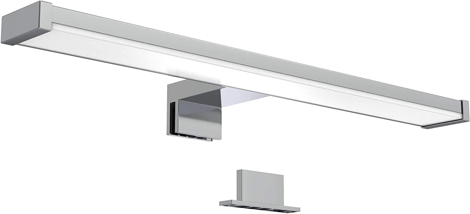 Die B.K.Licht Wandleuchte Spiegellampe ist eine moderne und elegante Lösung für die Beleuchtung von Spiegeln und Schränken. Mit einem fest verbauten 7W LED Modul und einer Lichtleistung von 600 Lumen bietet sie helles, neutral-weißes Licht mit 4.000 Kelvin. Die Leuchte kann sowohl festgeschraubt als auch auf Spiegel mit einer Dicke von bis zu 8 mm geklemmt werden. Ihre Abmessungen betragen 400 x 110 x 45 mm (BxTxH) und sie ist nach IP44 geschützt. **Highlights** - Fest verbautes 7W LED Modul: Kein zusätzlicher Kauf von Leuchtmitteln erforderlich. - Neutral-weißes Licht: Mit 4.000 Kelvin für eine natürliche Lichtfarbe, ideal zum Schminken. - Flexibel montierbar: Kann auf Spiegel bis 8 mm Dicke geklemmt oder festgeschraubt werden. - Schutzart IP44: Geeignet für den Einsatz im Badezimmer. - Langlebig: Lebensdauer von ca. 20.000 Stunden. **Produkteigenschaften** - Material: Metall / Kunststoff - Lichtleistung: 600 Lumen - Stromverbrauch: 7 Watt - Spannung: 230 Volt - Farbe: Chrom - Abmessungen (HxBxT): 45 x 400 x 110 mm **Lieferumfang** - 1x LED Spiegelleuchte chromfarben - Montageplatte (bereits mit der Leuchte verschraubt) - 1x Anschlussbox - 1x Montageset