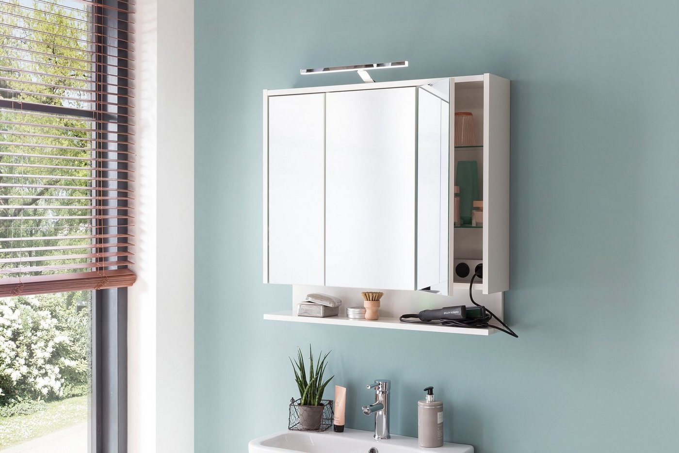 - Die integrierte LED-Aufsatzleuchte sorgt für eine helle und optimale Ausleuchtung Ihres Spiegelbildes, ideal für die tägliche Pflegeroutine.