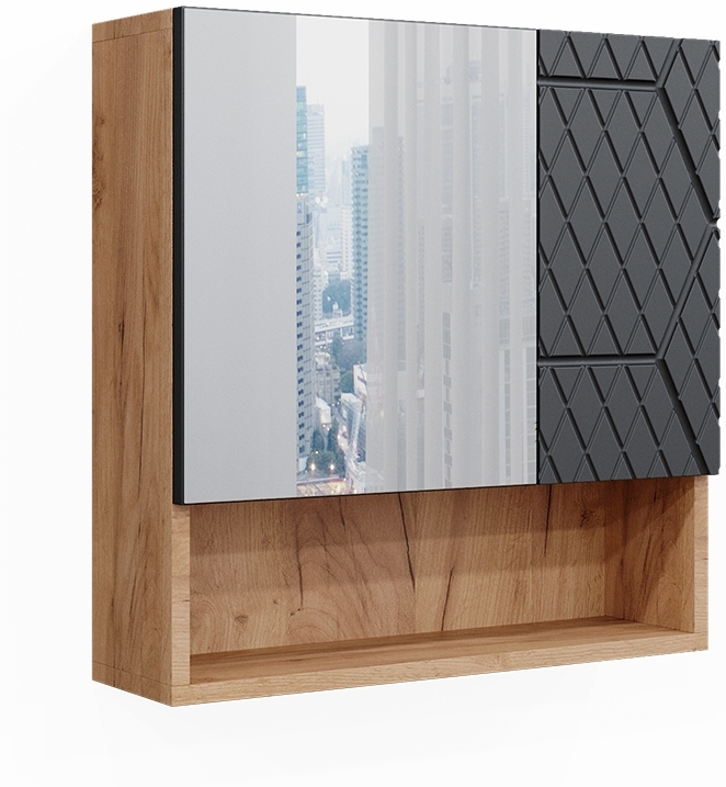 Der Vicco 'Irma' Spiegelschrank vereint stilvolles Design mit praktischer Funktionalität. Mit den Maßen 54 x 55 x 16,9 cm bietet er ausreichend Stauraum durch ein offenes und ein geschlossenes Fach. Der integrierte Spiegel ermöglicht eine bequeme Pflege und das elegante Anthrazit- und Goldkraft-Eiche-Design passt zu jedem Badezimmerdekor. Hergestellt aus melaminharzbeschichteter Spanplatte und Glas, ist dieser Spiegelschrank sowohl pflegeleicht als auch langlebig. **Highlights** - Offenes und geschlossenes Fach für optimalen Stauraum - Integrierter Spiegel für komfortable Pflege - Elegantes Design, passend zu jedem Badezimmerdekor - Pflegeleichte, melaminharzbeschichtete Spanplatte - Kompatibel mit anderen Produkten aus der Irma-Kollektion **Produkteigenschaften** - Maße: 54 x 55 x 16,9 cm (BxHxT) - Material: Korpus aus 16 mm Spanplatte, melaminharzbeschichtet - Spiegel aus Glas - Artikelgewicht: 8,91 kg - Artikelgewicht inkl. Verpackung: 9,9 kg **Lieferumfang** - Bad Spiegelschrank - Montageanleitung - Montagematerial