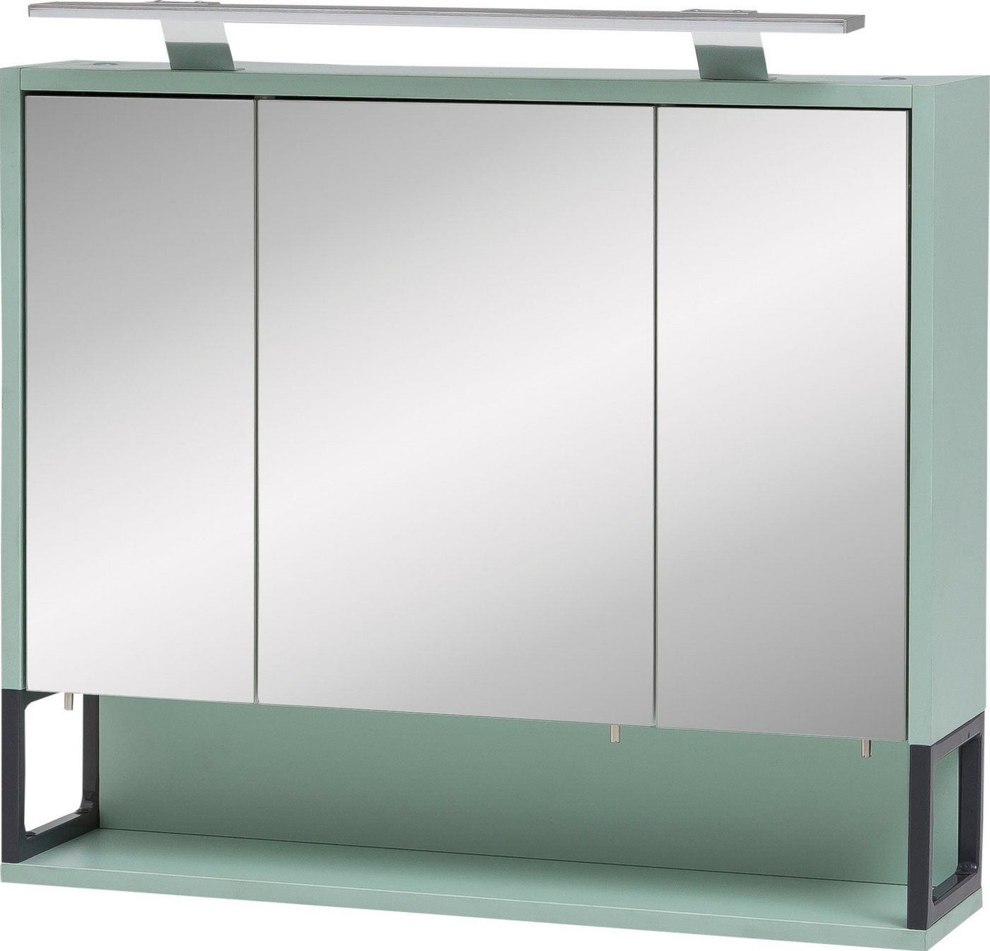 Der SCHILDMEYER Spiegelschrank »Limone« in mintfarben bietet mit seinen Gesamtmaßen von 70 x 61,1 x 16 cm nicht nur ein modernes Design, sondern auch praktischen Stauraum. Ausgestattet mit drei höhenverstellbaren Glas-Einlegeböden, einem offenen Fach und Türen mit Anschlagsdämpfung, sorgt er für Ordnung in Ihrem Badezimmer. Die integrierte LED-Leuchte mit 9,6 Watt und 420 Lumen bietet eine angenehme Beleuchtung. **Highlights** - 3-türiger Spiegelschrank für optimalen Stauraum - 3 höhenverstellbare Glas-Einlegeböden für flexible Nutzung - Türen mit Anschlagdämpfung für sanftes Schließen - Inklusive LED-Leuchte für angenehme Beleuchtung - Energieeffizienzklasse A für umweltfreundlichen Betrieb **Produkteigenschaften** - Maße (B x H x T): 70 x 61,1 x 16 cm - Offenes Fach (B/T/H) ca. 66,9 x 14,4 x 13 cm - Rahmen in anthrazit lackiert aus Stahl - Melaminharzbeschichtete Spanplatte - Stiftgriff verschraubt an Türkante - Hochwertige Metallbeschläge - Länge der Lampe: ca. 60 cm - Lichtfarbe: 4000 Kelvin, 420 Lumen **Lieferumfang** - 1 Spiegelschrank - 3 Glas-Einlegeböden - 1 offene Fach - 1 LED-Leuchte - 1 Schalter-/Steckdosenkombination - Exklusive Pflegeprodukte und Dekoration