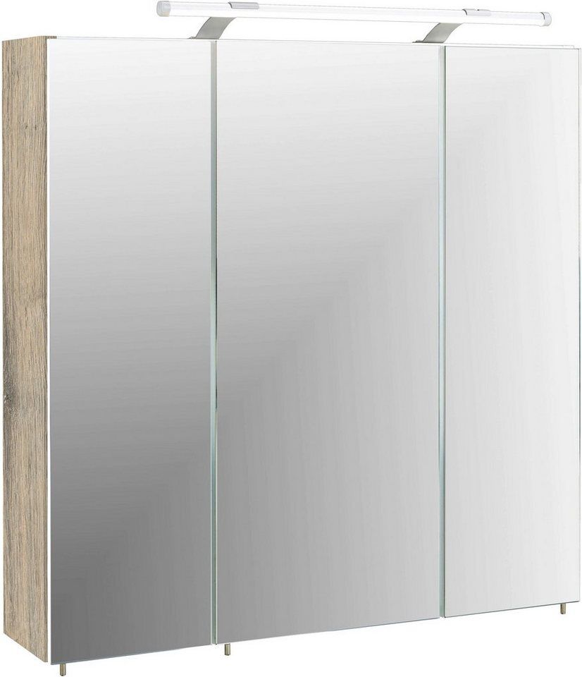 Maße: ca. 70 x 75 x 16 cm (B/H/T) Spiegelschrank mit 3 Türen und 6 höhenverstellbaren Glaseinlegeböden Ermöglicht den perfekten Rundumblick Inkl. LED-Beleuchtung und Schalter- Steckdosenkombination Hochwertige Griffe und Beschläge aus Metall Schnelle Montage mit verständlicher Aufbauanleitung, Hergestellt in Deutschland