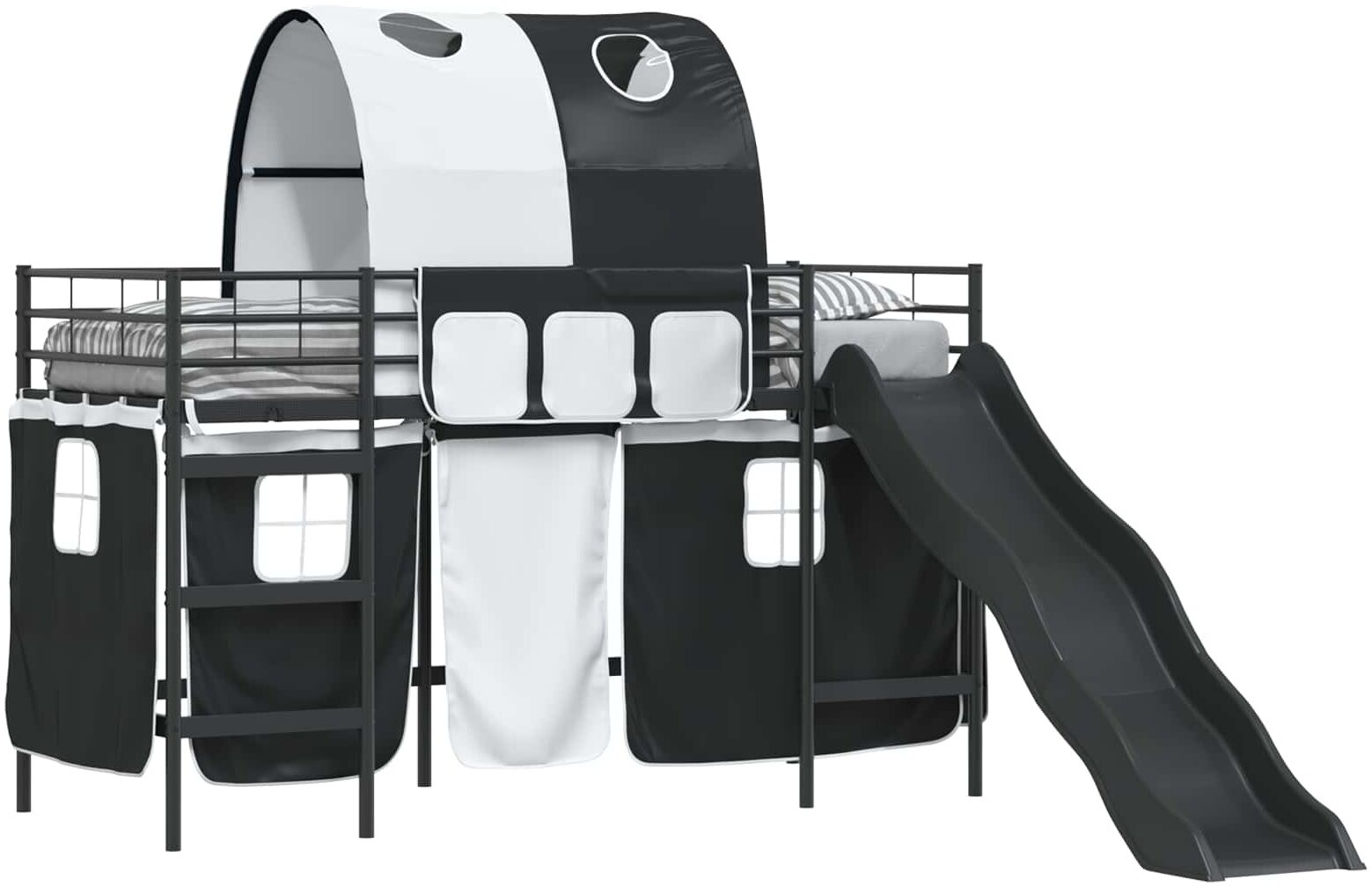 Das vidaXL Hochbett in Schwarz (74,5x190 cm) ist die perfekte Lösung für abenteuerlustige Kinder. Mit seinem stylischen Bogen-Design und den praktischen Vorhängen verwandelt es jedes Kinderzimmer in einen fantasievollen Rückzugsort. Der robuste Metallrahmen aus strapazierfähigem Stahl sorgt für Stabilität und Langlebigkeit, während die integrierte Rutsche das Aufstehen und Zubettgehen zum Vergnügen macht. Ideal für kreative Kids ab 3 Jahren. **Highlights** - Robuster Metallrahmen für Langlebigkeit und Stabilität - Vollendetes Kopfteil, das Platz spart und elegant aussieht - Praktische Vorhänge aus atmungsaktivem Material für besten Luftaustausch - Fester Plattform-Lattenrost für gleichmäßige Unterstützung - Sanfte Rutsche für sicheres und spaßiges Aufstehen **Produkteigenschaften** - Farbe: Schwarz - Rahmenmaterial: Stahl - Gesamtabmessungen: 194 x 80 x 116 cm (L x B x H) - Matratzengröße: 90x190 cm (kurzes Einzelbett) - Atmungsaktives Material - Langlebig - Montage erforderlich: Nein - EAN: 8721359328226 - SKU: 42020829 - Brand: vidaXL