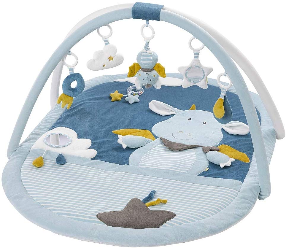 Mit coolem Vibrationsmodul, Tierstimme und anderen Spielzeugen: hier hat Baby eine MengeDie weiche Erlebnisdecke mit 5 abnehmbaren Spielsachen bietet dem Baby von Geburt an Spielspaß in den verschiedenen Wachstumsphasen - die perfekte erste Spieldecke für Weltentdecker! Das verborgene Raschelpapier, die lustige Quietsche, der kleine Spiegel und die Vibrations-Rassel fördern die Motorik und wecken eine natürliche Neugier zum Greifen, Kuscheln & Spielen Die ovale Krabbeldecke mit gepolsterter Liegefläche ist kuschelweich und schützt Mädchen und Jungen optimal bei der Erkundung der Welt des furchtlosen Drachen und der frechen Fledermaus Das Spielzeug aus Softvelour sollte bei 30°C gewaschen werden / Es besteht aus Softvelours und feinem Jersey Stoff und bildet ein fantasievolles Schloss in sanften Blautönen ab zu entdecken. - fünf abnehmbare Spielzeuge - Spiegel, Raschelpapier, Quietsche, Rassel, Tierstimme, Vibrationsmodul - Größe ca. 85 x 110 cm - waschbar bis 30°C - von Geburt an 0+