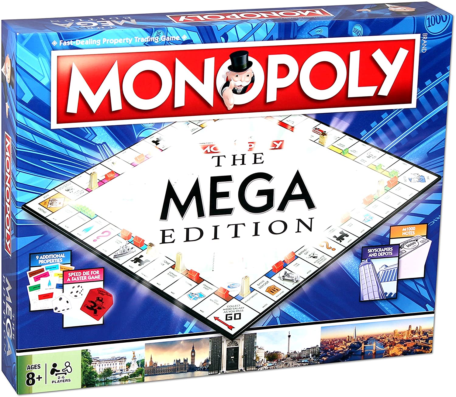 - Das Spielbrett der Mega-Edition von Monopoly umfasst 12 zusätzliche Felder, darunter acht neue Straßen für jede Farbgruppe.