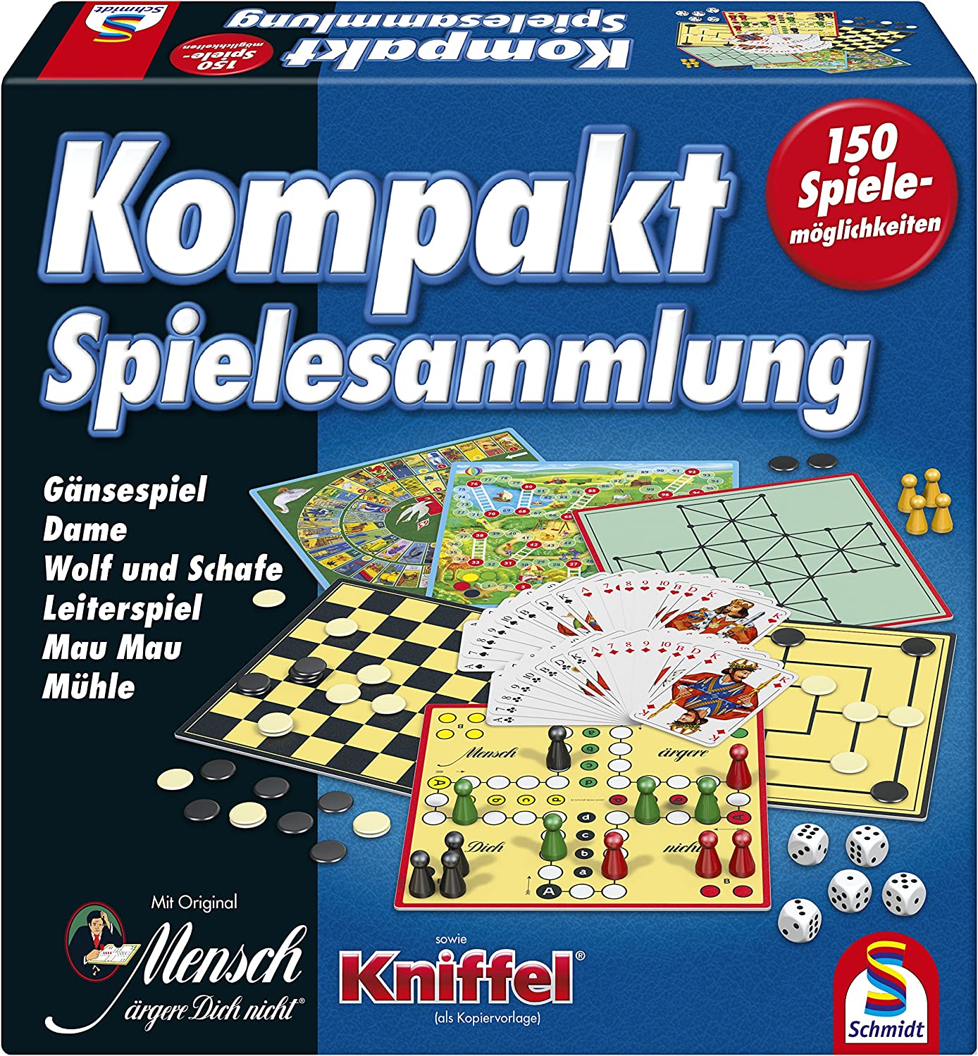 - Die Schmidt Spiele 49188 Kompakt Spielesammlung bietet 150 Spielemöglichkeiten mit verschiedenen Brett-, Karten- und Würfelspielen in einer praktischen Box.