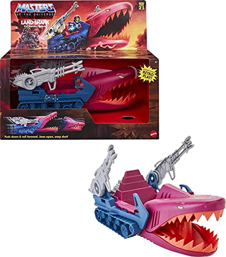 - Das MOTU Origins Land Shark Fahrzeug ist ein großes, grimmig aussehendes Spielzeug, das für die ca. 14 cm großen Origins Figuren geeignet ist.