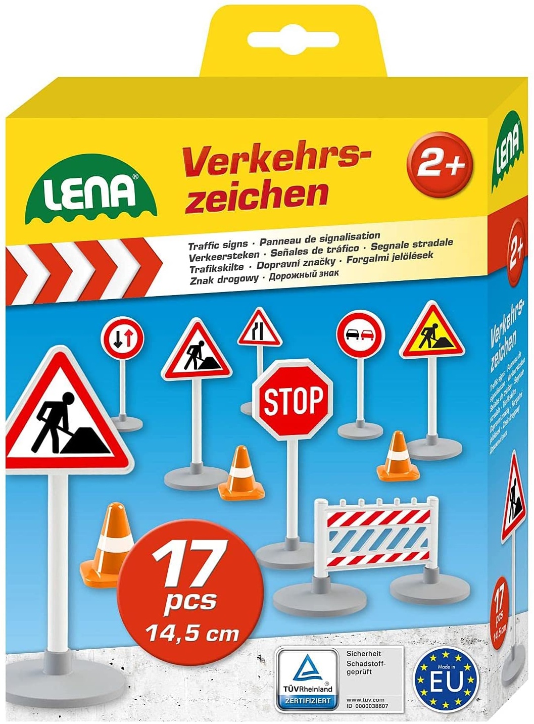 | Name | Lena 04440 - Verkehrszeichen Set mit 17 Teilen, mit 9 Verkehrsschilder ca. 16 cm, 5 Pylonen und 3 Bauzäunen, optimal für Lena Spielfahrzeuge Truxx, Worxx, Truckies, EcoAktives, Aktive und andere |
