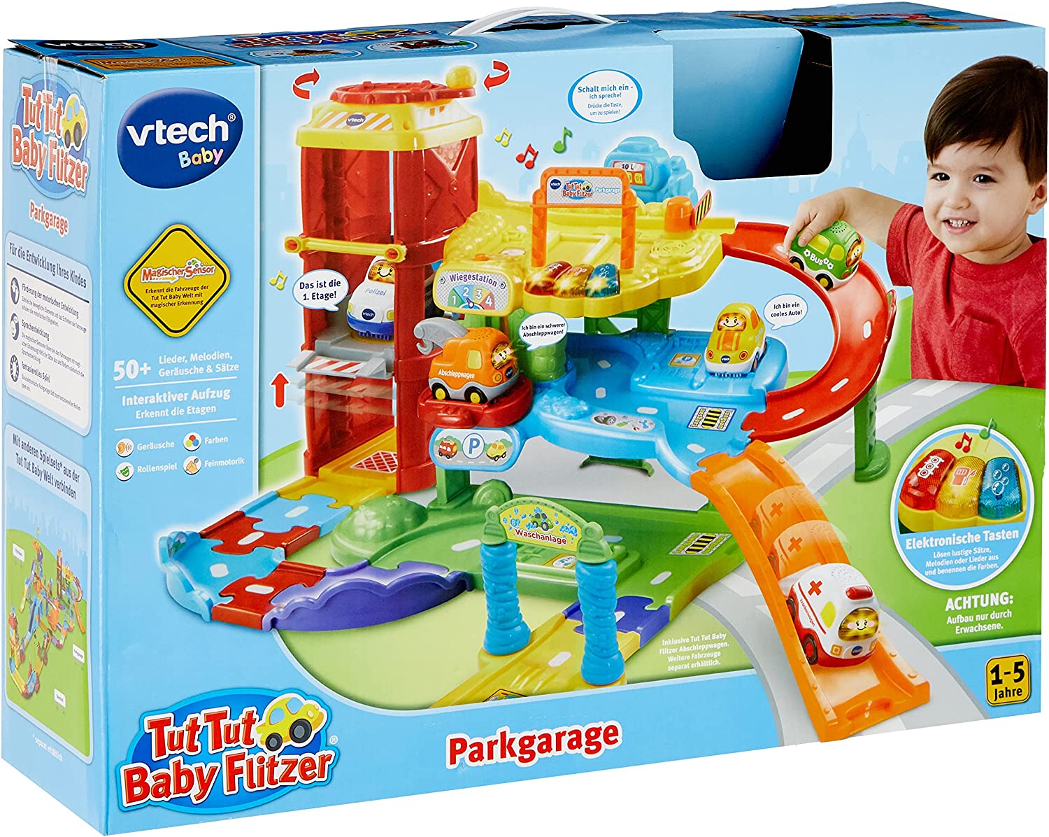 Spielen, lernen und parken: Die interaktive Tut Tut Baby Flitzer Parkgarage bietet mit dem sprechenden Abschleppwagen, Waschstraße, Tankstelle u. v. m. spannenden Spielspaß auf drei Etagen Die elektronische Garage lädt zum fantasievollen Rollenspiel ein - zahlreiche bewegliche Elemente und das Schieben der Fahrzeuge schulen dabei die motorischen Fähigkeiten Die magischen Sensoren lösen bei den Flitzern mit magischer Erkennung fröhliche Sätze aus und fördern die Sprachentwicklung / 3 aufleuchtende Tasten spielen lustige Sätze, Melodien oder Lieder ab Mit dem Fahrzeug-Lift bewegen sich die Fahrzeuge nach oben und nach unten / Das Kind kann die Schranke öffnen und schließen, um Lichter und Geräusche auszulösen Lieferumfang: 1 x V Tech Tut Tut Baby Flitzer - Parkgarage inkl. Abschleppwagen / Deutsche Version / 4 x AAA Demobatterien / Von Pädagogen entwickelt und getestet / Art. Nr: 80-180004, Hersteller: Vtech