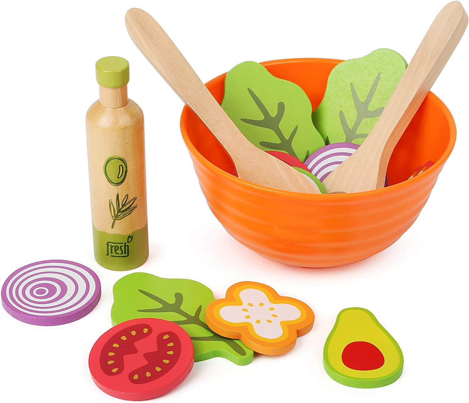 Heute gibt s Salat! Tomate, Zwiebel, Avocado, Salat, Gurke und Olivenöl in Form von robustem Holz dürfen in keinem Salat fehlen. Ganz spielerisch werden Kinder so im Rollenspiel an gesunde Ernährung herangeführt. In einer Kunststoffschale können sie sich eigene Kreationen zusammenstellen und alles mit dem Holzbesteck umrühren. Die perfekte Ergänzung für jede Spielküche! Größe: Schüssel Höhe: ca. 7 cm, Ø ca. 14 cm, Tomatenscheibe Höhe: ca. 0,5 cm, Ø ca. 5 cm Altersempfehlung: ab 24 Monate Hersteller-Artikelnummer: 11476