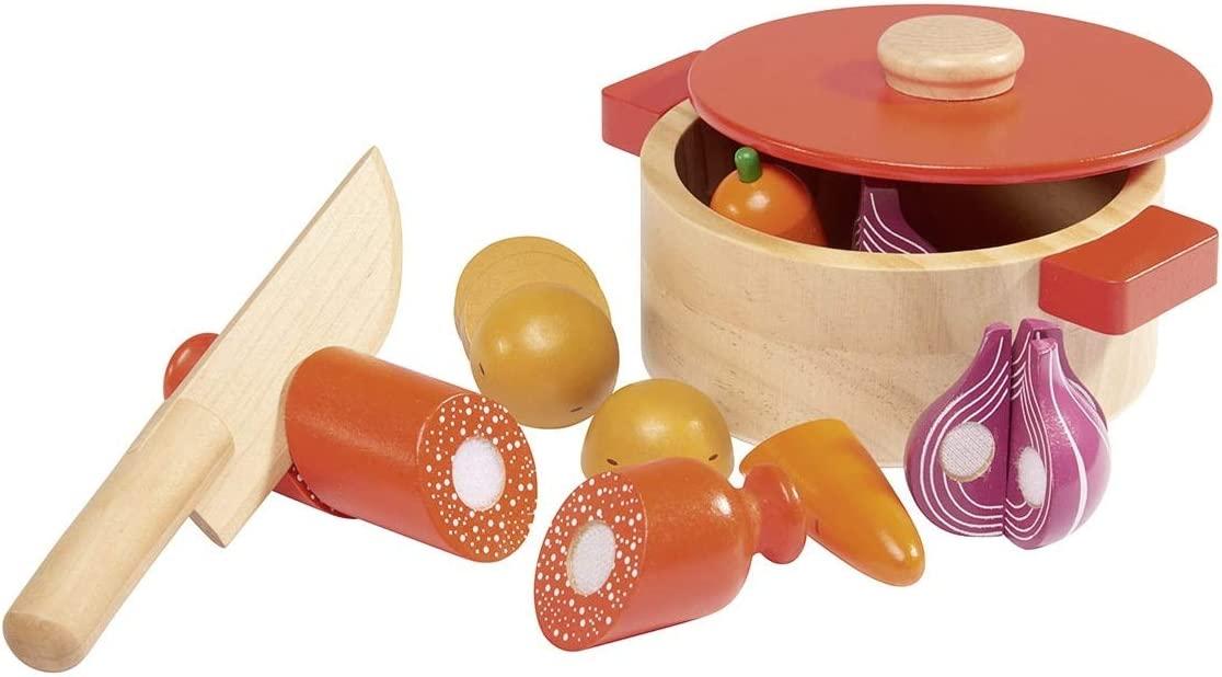 - Das Set besteht aus 16 Teilen, darunter Eintopf und Lebensmittel aus Holz, und ist für Kinder ab ca. 18 Monaten geeignet.