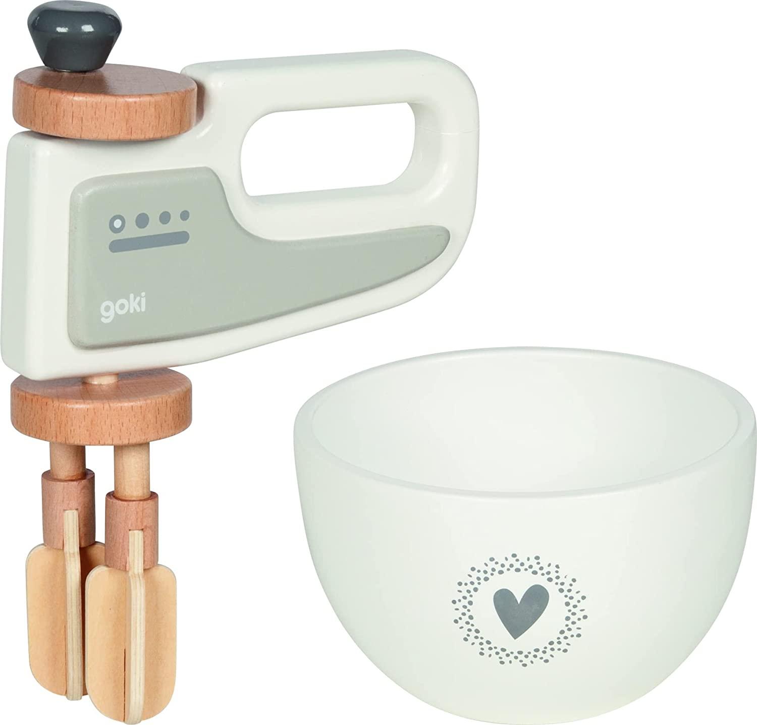 Handmixer mit Rührschüssel Klassisches Holzspielzeug für die Puppenküche: hier wird gerührt und gemixt - die Bedienung funktioniert über die Betätigung der Kurbel. Da macht das Kochen gleich doppelt so viel spass. Wir führen auch noch andere Küchengeräte. Größe : 14,5 x 5 x 19,5 cm Für Kinder ab 3 Jahre geeignet.