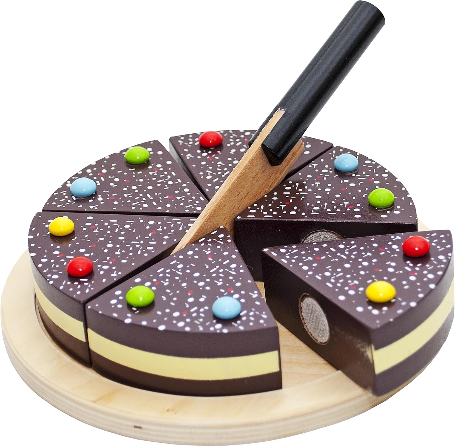• Die Schokoladentorte aus Holz enthält einen Holzteller, eine Torte und ein stumpfes Holzmesser.