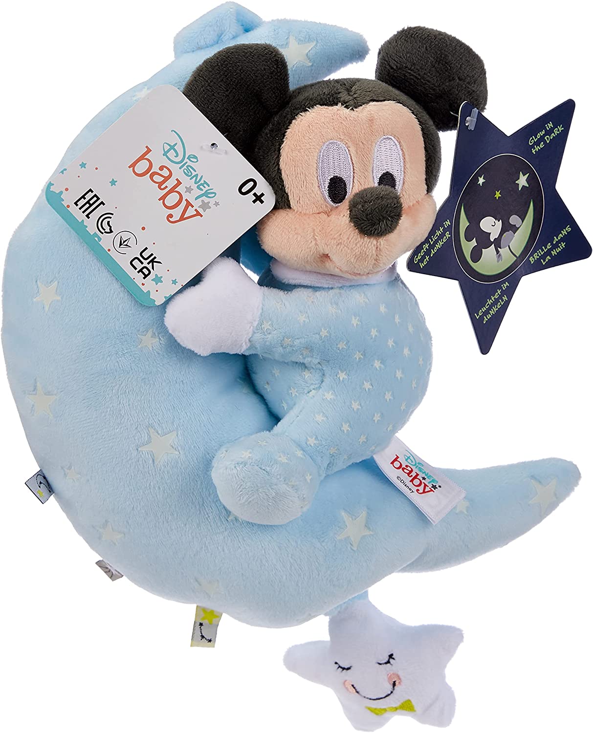 - Mickey Maus trägt einen hellblauen Strampler und sitzt auf einem Mond aus kuschelweichem Plüsch.
