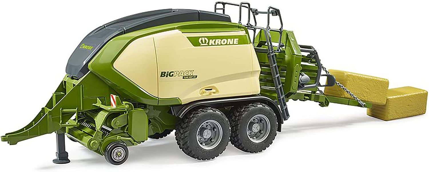 Die Firma Krone ist ein innovativer Hersteller von Erntemaschinen. Mit der neuen Baureihe der BiG Pack Großpackenpressen zeigt KRONE einmal mehr, dass auch nach mehr als 25 Jahren die Innovationskraft keinesfalls nachlässt. Die BiG Pack 1290 ist das Top Modell von KRONE und neu im landwirtschaftlichen Sortiment von BRUDER zu finden. Wie das Original, überzeugt auch das Spielzeug mit innovativen Funktionen. Der Pick-up ist abklappbar und wird über seitliche Räder angetrieben. Die Seitenklappen sind zu Öffnen und bieten Zugang zur detaillierten Mechanik. 2 Großballen können über die Mittelklappe eingelegt werden und die Presse transportiert, bei aktivem Pickup, diese automatisch zum Auswurf. Dieses tolle, neue Modell von BRUDER passt an alle Traktoren der 2000er, 3000er und 4000er Serie. Für noch mehr Spielspaß kann das Zubehör Quaderballen (Art.-Nr. 02342) hinzugefügt werden. **Fahrzeugaufbau** - Ballenauswurf - Pick-up ist abklappbar und wird während der Fahrt über Tasträder angetrieben - Wartungsklappe zum Öffnen **Inhalt** - 2 Quaderballen **Bewegung/Funktion** - Transportsystem zum Auswurf des Quaderballens **Allgemein** - Achtung! Nicht für Kinder unter 36 Monaten geeignet. Erstickungsgefahr wegen verschluckbarer Kleinteile. - Altersempfehlung: ab 4 Jahren zum Spielen für Innen und Außen geeignet - Hergestellt aus hochwertigen Kunststoffen wie z.B. ABS - Kompatibel mit Figur - Maßstab 1:16